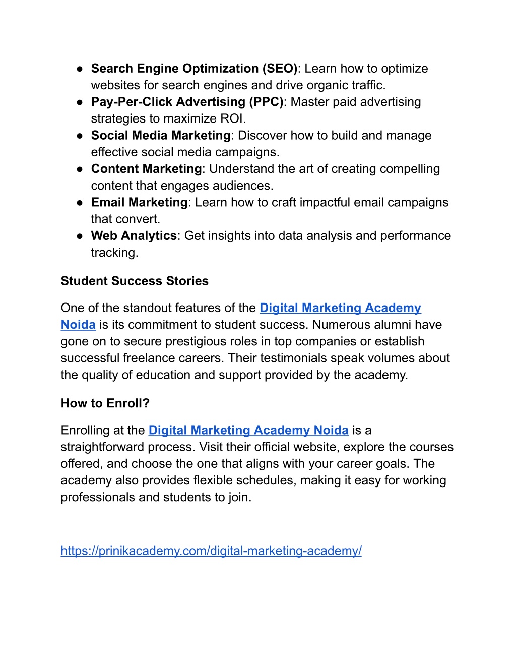 ● Search Engine Optimization (SEO): Learn how to optimize websites for search engines and drive organic traffic. ● Pay-Per-Click Advertising (PPC): Master paid advertising strategies to maximize ROI. ● Social Media Marketing: Discover how to build and manage effective social media campaigns. ● Content Marketing: Understand the art of creating compelling content that engages audiences. ● Email Marketing: Learn how to craft impactful email campaigns that convert. ● Web Analytics: Get insights into data analysis and performance tracking. Student Success Stories One of the standout features of the Digital Marketing Academy Noida is its commitment to student success. Numerous alumni have gone on to secure prestigious roles in top companies or establish successful freelance careers. Their testimonials speak volumes about the quality of education and support provided by the academy. How to Enroll? Enrolling at the Digital Marketing Academy Noida is a straightforward process. Visit their official website, explore the courses offered, and choose the one that aligns with your career goals. The academy also provides flexible schedules, making it easy for working professionals and students to join. https://prinikacademy.com/digital-marketing-academy/
