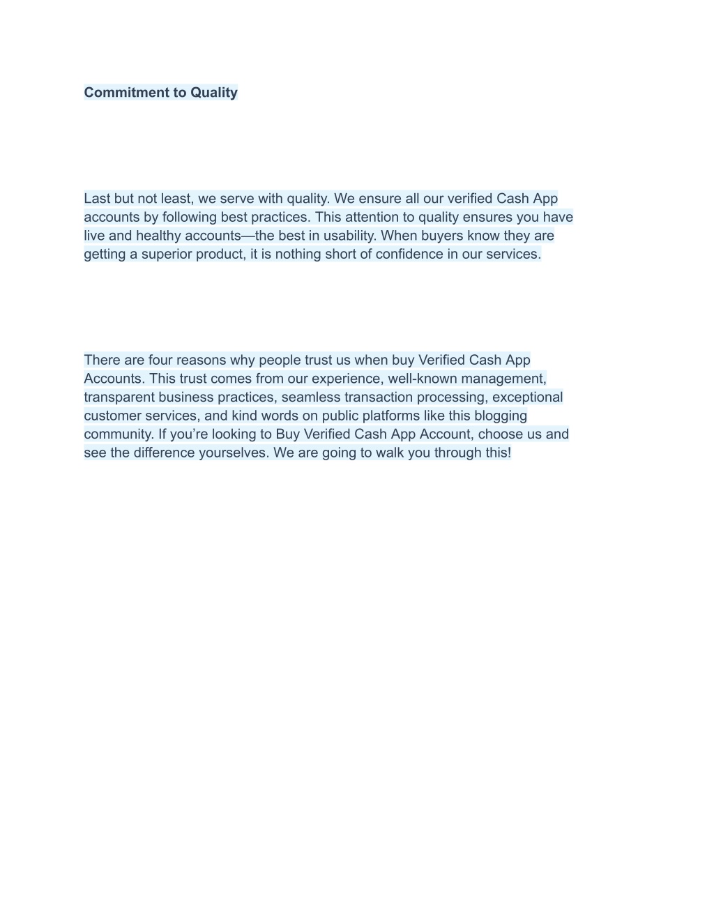Commitment to Quality Last but not least, we serve with quality. We ensure all our verified Cash App accounts by following best practices. This attention to quality ensures you have live and healthy accounts—the best in usability. When buyers know they are getting a superior product, it is nothing short of confidence in our services. There are four reasons why people trust us when buy Verified Cash App Accounts. This trust comes from our experience, well-known management, transparent business practices, seamless transaction processing, exceptional customer services, and kind words on public platforms like this blogging community. If you’re looking to Buy Verified Cash App Account, choose us and see the difference yourselves. We are going to walk you through this!