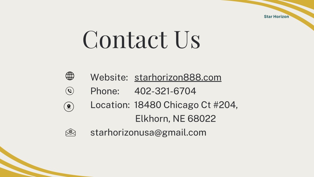 Contact Us Website: starhorizon888.com Phone: 402-321-6704 Location: 18480 Chicago Ct #204, Elkhorn, NE 68022 starhorizonusa@gmail.com