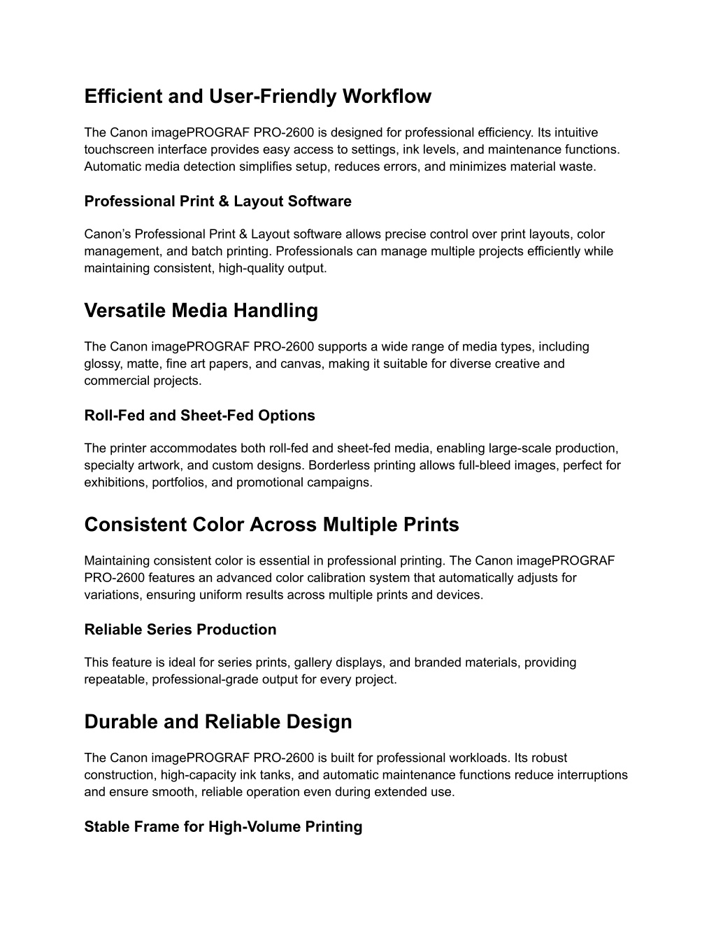 2. Efficient and User-Friendly Workflow The Canon imagePROGRAF PRO-2600 is designed for professional efficiency. Its intuitive touchscreen interface provides easy access to settings, ink levels, and maintenance functions. Automatic media detection simplifies setup, reduces errors, and minimizes material waste. Professional Print & Layout Software Canon’s Professional Print & Layout software allows precise control over print layouts, color management, and batch printing. Professionals can manage multiple projects efficiently while maintaining consistent, high-quality output. Versatile Media Handling The Canon imagePROGRAF PRO-2600 supports a wide range of media types, including glossy, matte, fine art papers, and canvas, making it suitable for diverse creative and commercial projects. Roll-Fed and Sheet-Fed Options The printer accommodates both roll-fed and sheet-fed media, enabling large-scale production, specialty artwork, and custom designs. Borderless printing allows full-bleed images, perfect for exhibitions, portfolios, and promotional campaigns. Consistent Color Across Multiple Prints Maintaining consistent color is essential in professional printing. The Canon imagePROGRAF PRO-2600 features an advanced color calibration system that automatically adjusts for variations, ensuring uniform results across multiple prints and devices. Reliable Series Production This feature is ideal for series prints, gallery displays, and branded materials, providing repeatable, professional-grade output for every project. Durable and Reliable Design The Canon imagePROGRAF PRO-2600 is built for professional workloads. Its robust construction, high-capacity ink tanks, and automatic maintenance functions reduce interruptions and ensure smooth, reliable operation even during extended use. Stable Frame for High-Volume Printing
