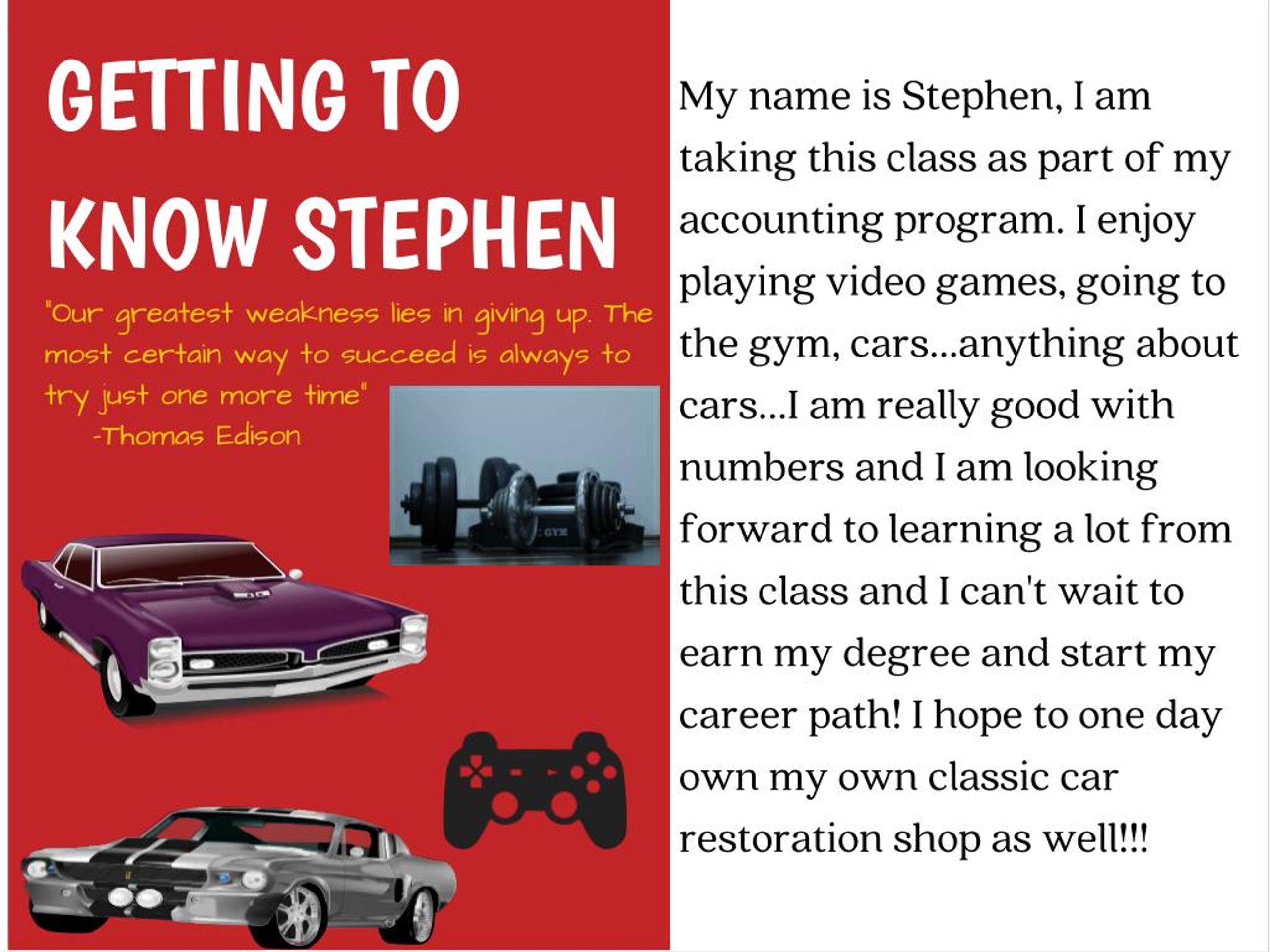 My name is Stephen, I am taking this class as part of my accounting program. I enjoy playing video games, going to the gym, cars...anything about cars...I am really good with numbers and I am looking forward to learning a lot from this class and I can't wait to earn my degree and start my career path! I hope to one day own my own classic car restoration shop as well!!! GETTING TO KNOW STEPHEN "Our greatest weakness lies in giving up. The most certain way to succeed is always to try just one more time" -Thomas Edison