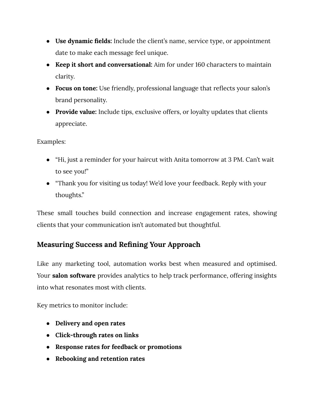 ● Use dynamic fields: Include the client’s name, service type, or appointment date to make each message feel unique. ● Keep it short and conversational: Aim for under 160 characters to maintain clarity. ● Focus on tone: Use friendly, professional language that reflects your salon’s brand personality. ● Provide value: Include tips, exclusive offers, or loyalty updates that clients appreciate. Examples: ● “Hi, just a reminder for your haircut with Anita tomorrow at 3 PM. Can’t wait to see you!” ● “Thank you for visiting us today! We’d love your feedback. Reply with your thoughts.” These small touches build connection and increase engagement rates, showing clients that your communication isn’t automated but thoughtful. Measuring Success and Refining Your Approach Like any marketing tool, automation works best when measured and optimised. Your salon software provides analytics to help track performance, offering insights into what resonates most with clients. Key metrics to monitor include: ● Delivery and open rates ● Click-through rates on links ● Response rates for feedback or promotions ● Rebooking and retention rates