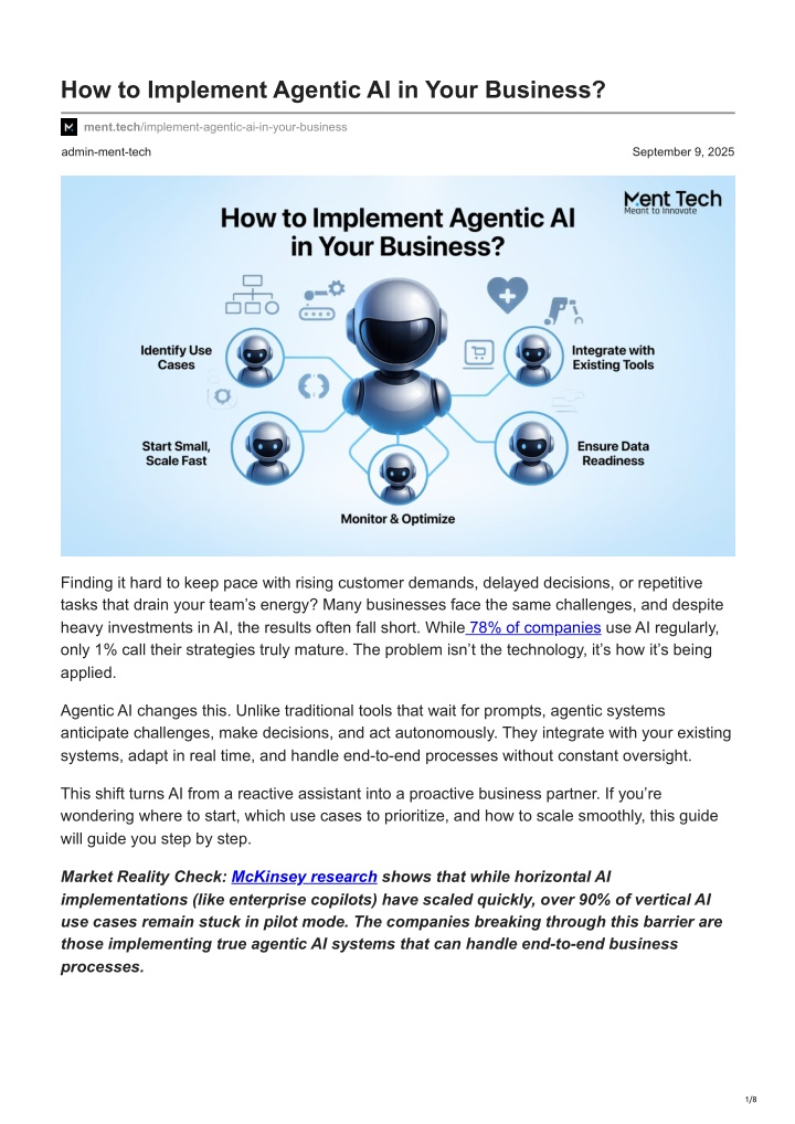 1. How to Implement Agentic AI in Your Business? ment.tech/implement-agentic-ai-in-your-business admin-ment-tech September 9, 2025 Finding it hard to keep pace with rising customer demands, delayed decisions, or repetitive tasks that drain your team’s energy? Many businesses face the same challenges, and despite heavy investments in AI, the results often fall short. While 78% of companies use AI regularly, only 1% call their strategies truly mature. The problem isn’t the technology, it’s how it’s being applied. Agentic AI changes this. Unlike traditional tools that wait for prompts, agentic systems anticipate challenges, make decisions, and act autonomously. They integrate with your existing systems, adapt in real time, and handle end-to-end processes without constant oversight. This shift turns AI from a reactive assistant into a proactive business partner. If you’re wondering where to start, which use cases to prioritize, and how to scale smoothly, this guide will guide you step by step. Market Reality Check: McKinsey research shows that while horizontal AI implementations (like enterprise copilots) have scaled quickly, over 90% of vertical AI use cases remain stuck in pilot mode. The companies breaking through this barrier are those implementing true agentic AI systems that can handle end-to-end business processes. 1/8