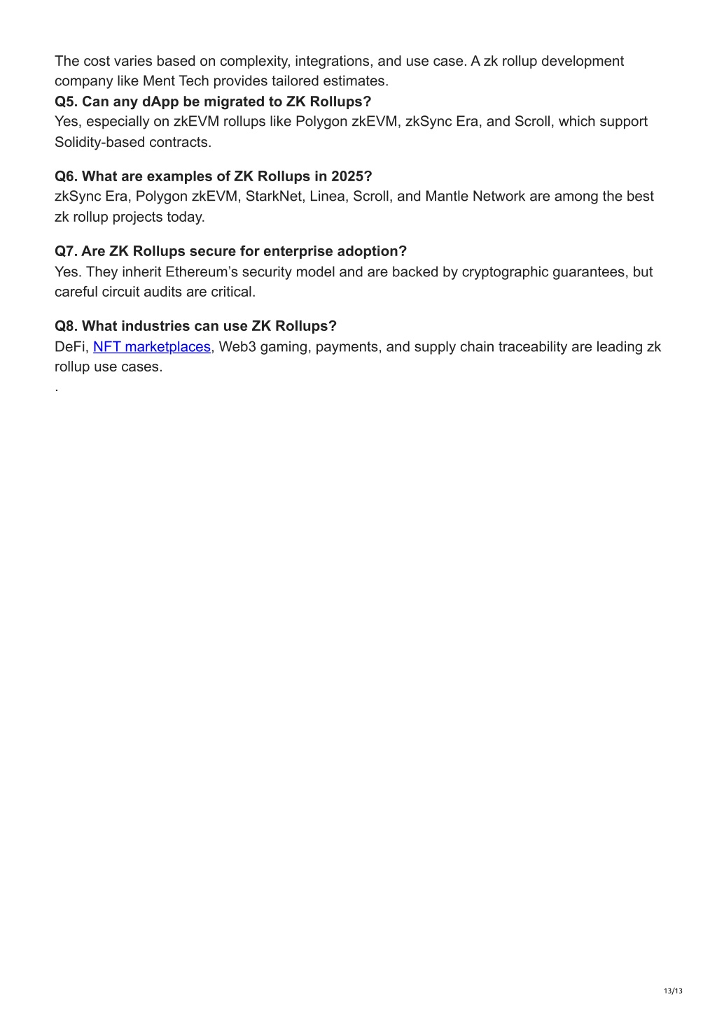 The cost varies based on complexity, integrations, and use case. A zk rollup development company like Ment Tech provides tailored estimates. Q5. Can any dApp be migrated to ZK Rollups? Yes, especially on zkEVM rollups like Polygon zkEVM, zkSync Era, and Scroll, which support Solidity-based contracts. Q6. What are examples of ZK Rollups in 2025? zkSync Era, Polygon zkEVM, StarkNet, Linea, Scroll, and Mantle Network are among the best zk rollup projects today. Q7. Are ZK Rollups secure for enterprise adoption? Yes. They inherit Ethereum’s security model and are backed by cryptographic guarantees, but careful circuit audits are critical. Q8. What industries can use ZK Rollups? DeFi, NFT marketplaces, Web3 gaming, payments, and supply chain traceability are leading zk rollup use cases. . 13/13