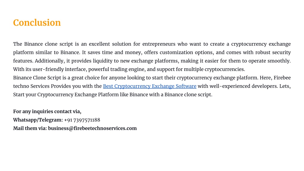 Conclusion The Binance clone script is an excellent solution for entrepreneurs who want to create a cryptocurrency exchange platform similar to Binance. It saves time and money, offers customization options, and comes with robust security features. Additionally, it provides liquidity to new exchange platforms, making it easier for them to operate smoothly. With its user-friendly interface, powerful trading engine, and support for multiple cryptocurrencies. Binance Clone Script is a great choice for anyone looking to start their cryptocurrency exchange platform. Here, Firebee techno Services Provides you with the Best Cryptocurrency Exchange Software with well-experienced developers. Lets, Start your Cryptocurrency Exchange Platform like Binance with a Binance clone script. For any inquiries contact via, Whatsapp/Telegram: +91 7397571188 Mail them via: business@firebeetechnoservices.com