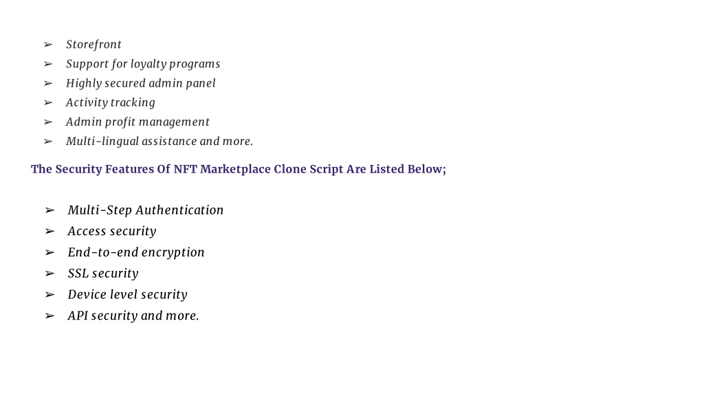 Storefront • Support for loyalty programs • Highly secured admin panel • Activity tracking • Admin profit management • Multi-lingual assistance and more. The Security Features Of NFT Marketplace Clone Script Are Listed Below; • Multi-Step Authentication • Access security • End-to-end encryption • SSL security • Device level security • API security and more.