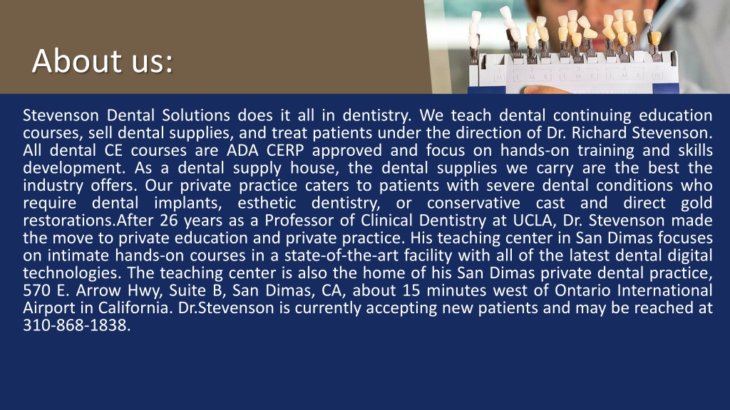 About us: Stevenson Dental Solutions does it all in dentistry. We teach dental continuing education courses, sell dental supplies, and treat patients under the direction of Dr. Richard Stevenson. All dental CE courses are ADA CERP approved and focus on hands-on training and skills development. As a dental supply house, the dental supplies we carry are the best the industry offers. Our private practice caters to patients with severe dental conditions who require dental implants, esthetic dentistry, or conservative cast and direct gold restorations.After 26 years as a Professor of Clinical Dentistry at UCLA, Dr. Stevenson made the move to private education and private practice. His teaching center in San Dimas focuses on intimate hands-on courses in a state-of-the-art facility with all of the latest dental digital technologies. The teaching center is also the home of his San Dimas private dental practice, 570 E. Arrow Hwy, Suite B, San Dimas, CA, about 15 minutes west of Ontario International Airport in California. Dr.Stevenson is currently accepting new patients and may be reached at 310-868-1838.