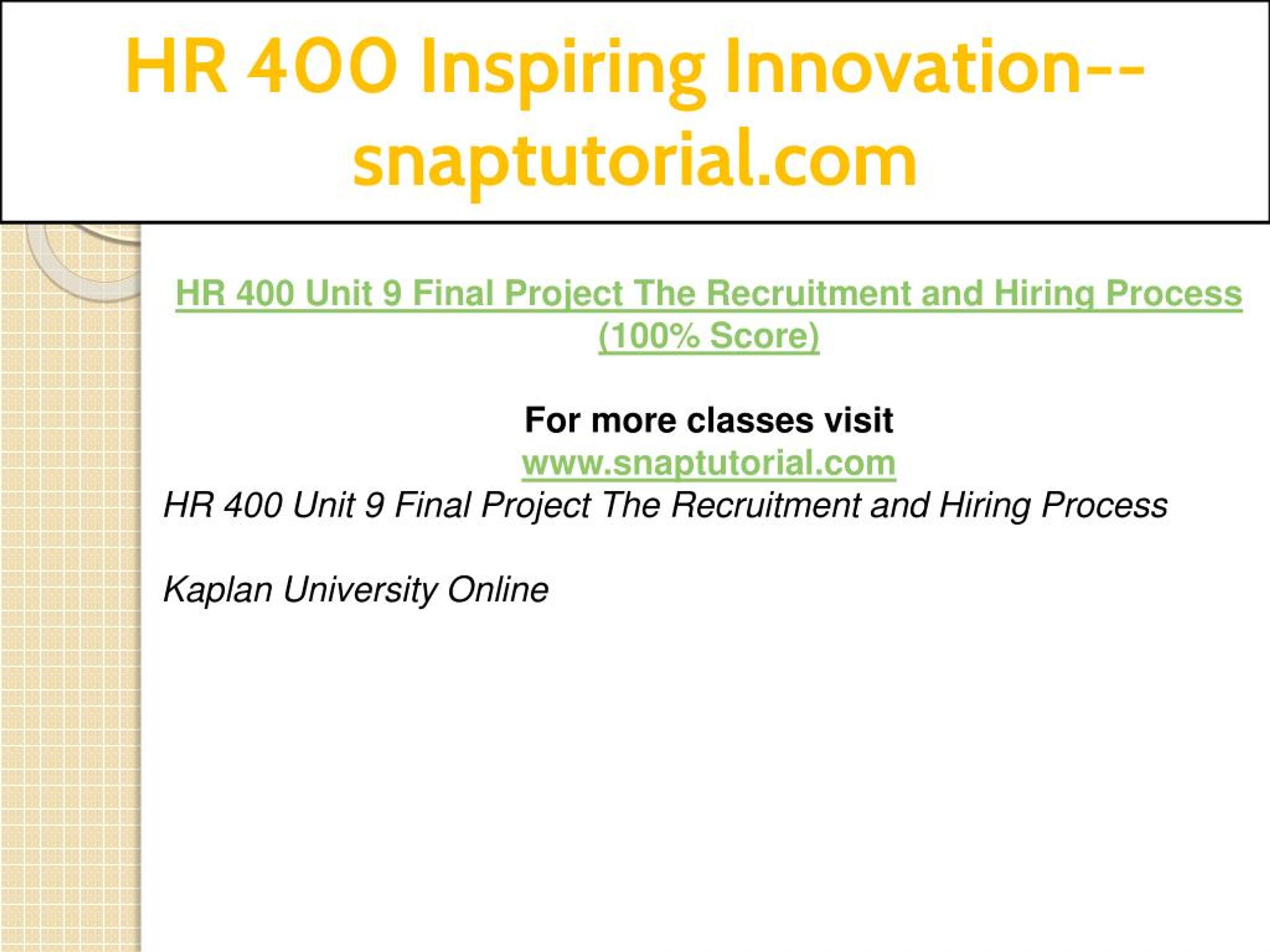HR 400 Inspiring Innovation--snaptutorial.com HR 400 Unit 9 Final Project The Recruitment and Hiring Process (100% Score) For more classes visit www.snaptutorial.com HR 400 Unit 9 Final Project The Recruitment and Hiring Process Kaplan University Online