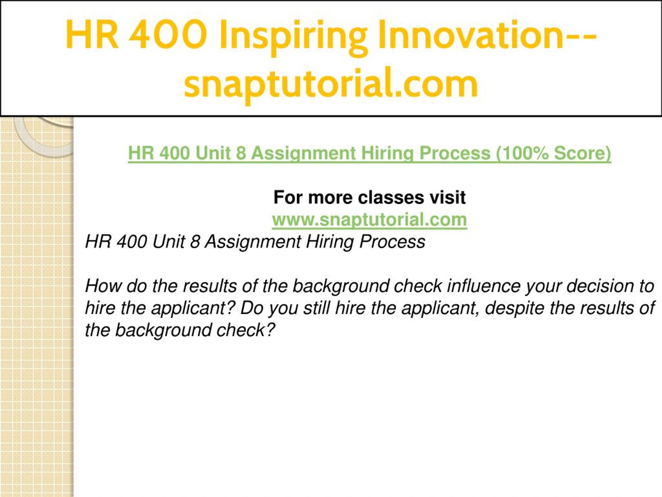 HR 400 Inspiring Innovation--snaptutorial.com HR 400 Unit 8 Assignment Hiring Process (100% Score) For more classes visit www.snaptutorial.com HR 400 Unit 8 Assignment Hiring Process How do the results of the background check influence your decision to hire the applicant? Do you still hire the applicant, despite the results of the background check?