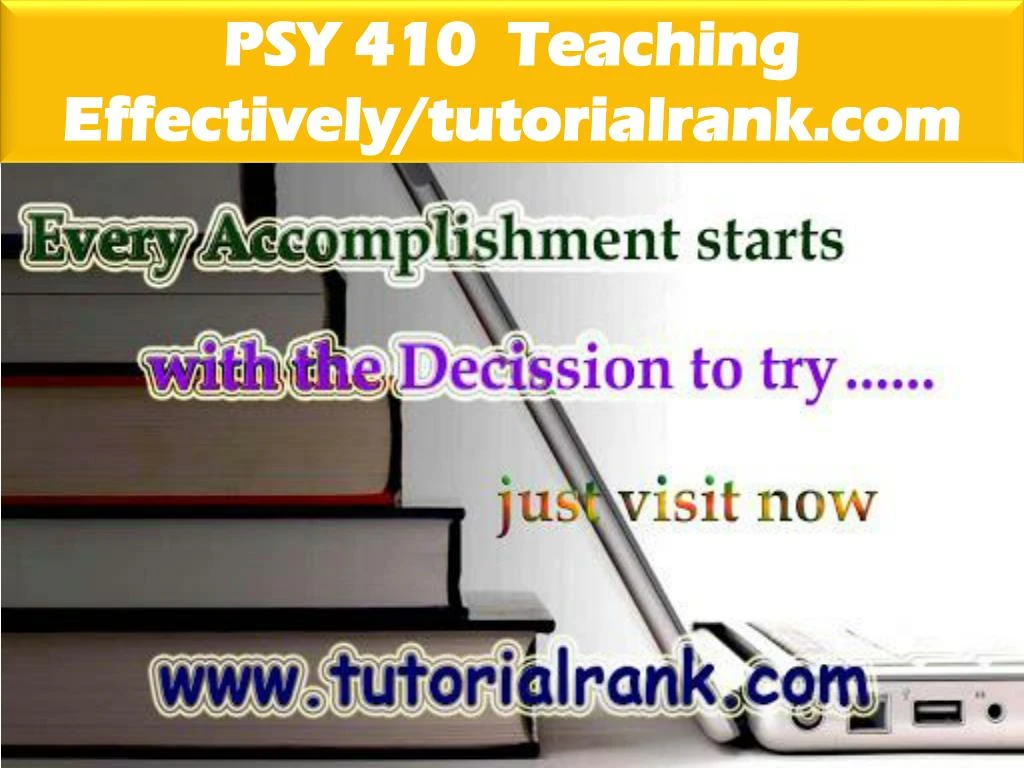 PSY 410 Teaching Effectively/tutorialrank.com PSY 410 Entire Course (UOP Course) For more course tutorials visit www.tutorialrank.com Tutorial Purchased: 6 Times, Rating: A+ PSY 410 Week 1 Discussion Question 1 (UOP Course) PSY 410 Week 1 Discussion Question 2 (UOP Course)