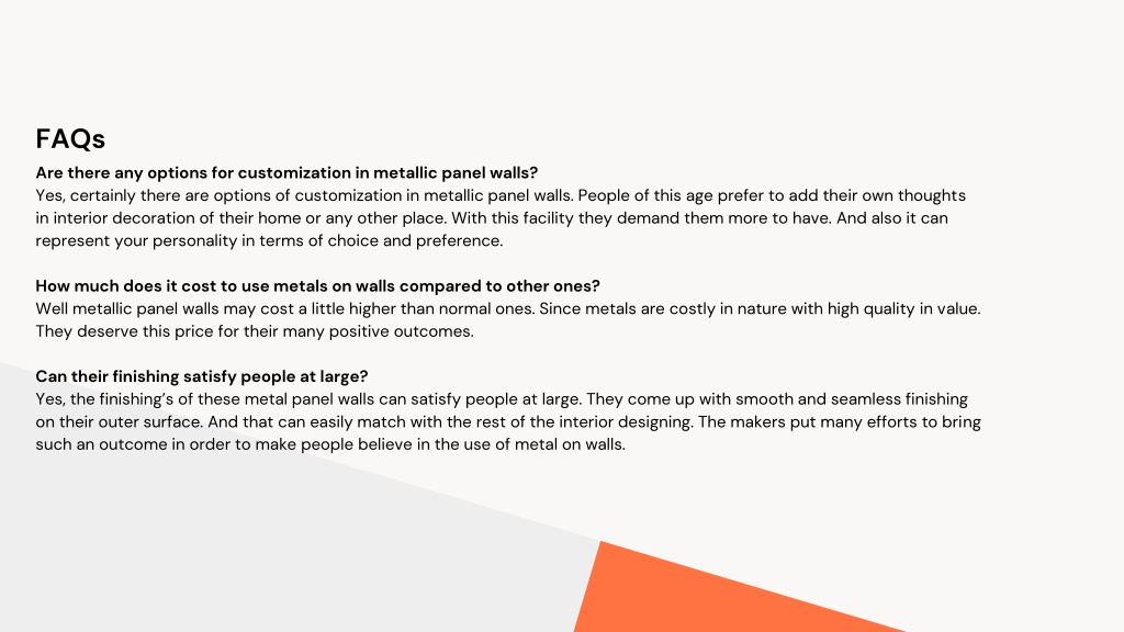 FAQs • Are there any options for customization in metallic panel walls? • Yes, certainly there are options of customization in metallic panel walls. People of this age prefer to add their own thoughts in interior decoration of their home or any other place. With this facility they demand them more to have. And also it can represent your personality in terms of choice and preference. • How much does it cost to use metals on walls compared to other ones? • Well metallic panel walls may cost a little higher than normal ones. Since metals are costly in nature with high quality in value. They deserve this price for their many positive outcomes. • Can their finishing satisfy people at large? • Yes, the finishing’s of these metal panel walls can satisfy people at large. They come up with smooth and seamless finishing on their outer surface. And that can easily match with the rest of the interior designing. The makers put many efforts to bring such an outcome in order to make people believe in the use of metal on walls.