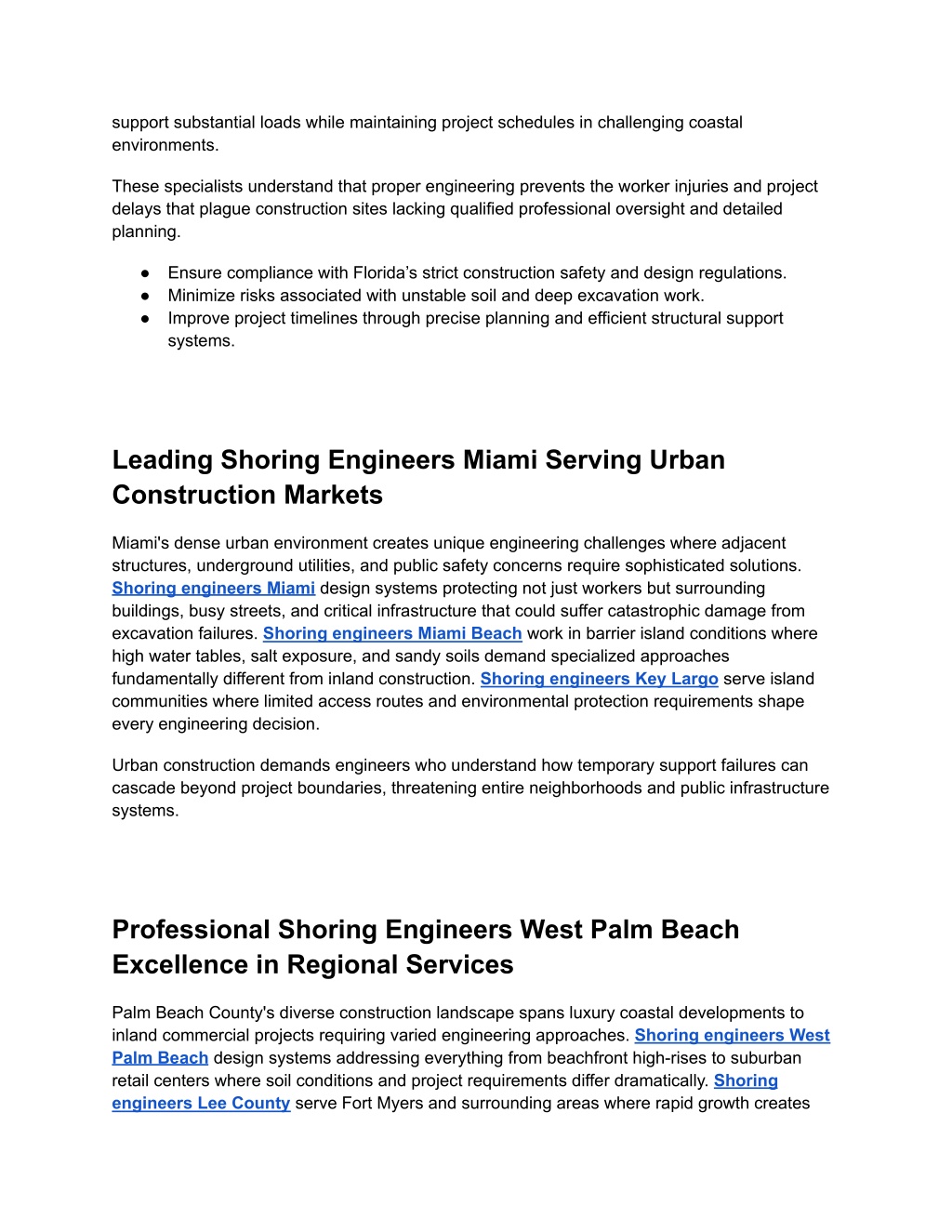 support substantial loads while maintaining project schedules in challenging coastal environments. These specialists understand that proper engineering prevents the worker injuries and project delays that plague construction sites lacking qualified professional oversight and detailed planning. ● Ensure compliance with Florida’s strict construction safety and design regulations. ● Minimize risks associated with unstable soil and deep excavation work. ● Improve project timelines through precise planning and efficient structural support systems. Leading Shoring Engineers Miami Serving Urban Construction Markets Miami's dense urban environment creates unique engineering challenges where adjacent structures, underground utilities, and public safety concerns require sophisticated solutions. Shoring engineers Miami design systems protecting not just workers but surrounding buildings, busy streets, and critical infrastructure that could suffer catastrophic damage from excavation failures. Shoring engineers Miami Beach work in barrier island conditions where high water tables, salt exposure, and sandy soils demand specialized approaches fundamentally different from inland construction. Shoring engineers Key Largo serve island communities where limited access routes and environmental protection requirements shape every engineering decision. Urban construction demands engineers who understand how temporary support failures can cascade beyond project boundaries, threatening entire neighborhoods and public infrastructure systems. Professional Shoring Engineers West Palm Beach Excellence in Regional Services Palm Beach County's diverse construction landscape spans luxury coastal developments to inland commercial projects requiring varied engineering approaches. Shoring engineers West Palm Beach design systems addressing everything from beachfront high-rises to suburban retail centers where soil conditions and project requirements differ dramatically. Shoring engineers Lee County serve Fort Myers and surrounding areas where rapid growth creates