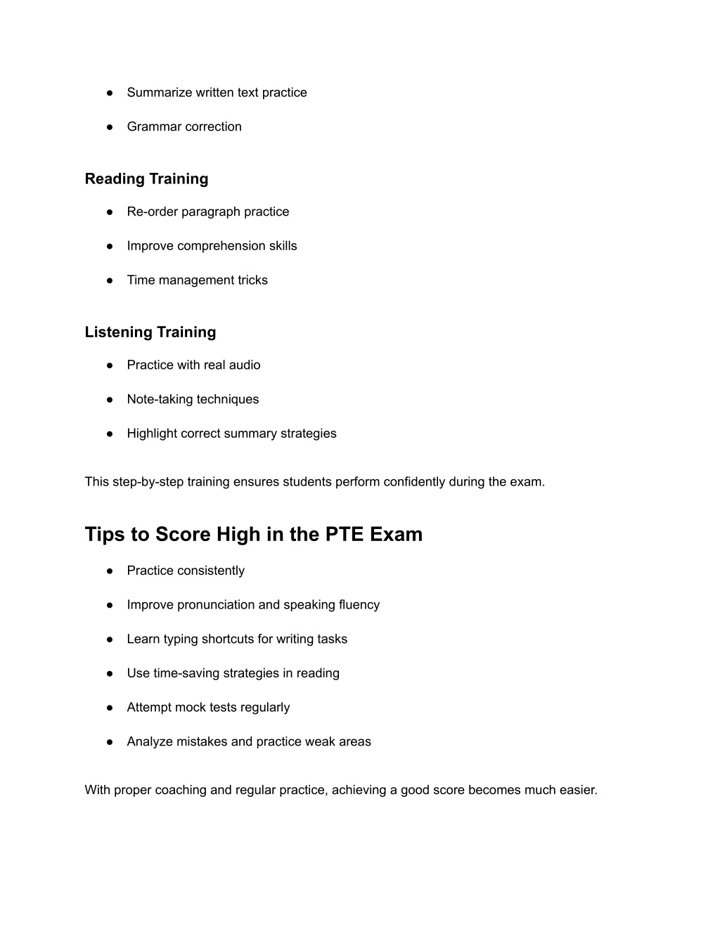 ● Summarize written text practice ● Grammar correction Reading Training ● Re-order paragraph practice ● Improve comprehension skills ● Time management tricks Listening Training ● Practice with real audio ● Note-taking techniques ● Highlight correct summary strategies This step-by-step training ensures students perform confidently during the exam. Tips to Score High in the PTE Exam ● Practice consistently ● Improve pronunciation and speaking fluency ● Learn typing shortcuts for writing tasks ● Use time-saving strategies in reading ● Attempt mock tests regularly ● Analyze mistakes and practice weak areas With proper coaching and regular practice, achieving a good score becomes much easier.