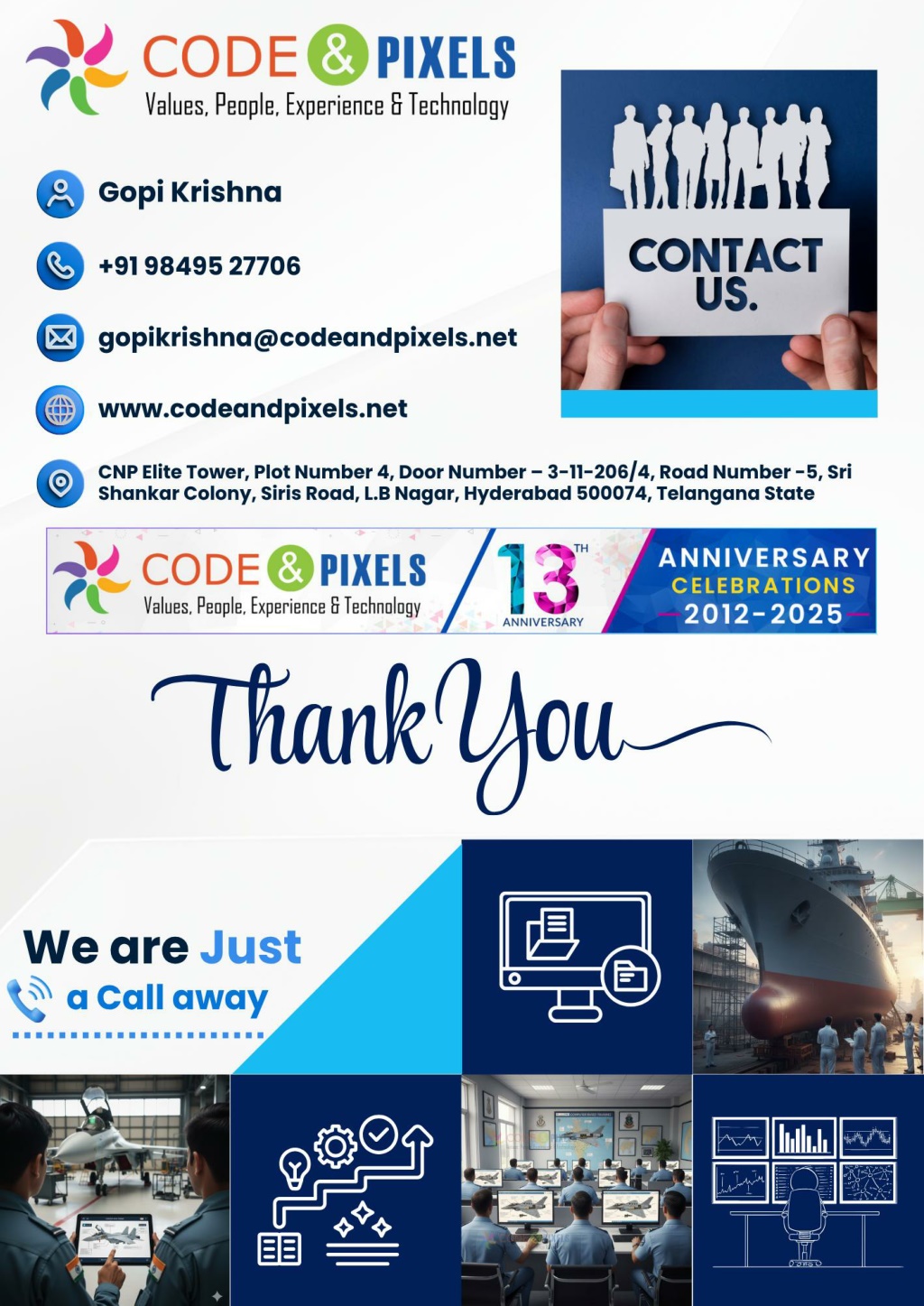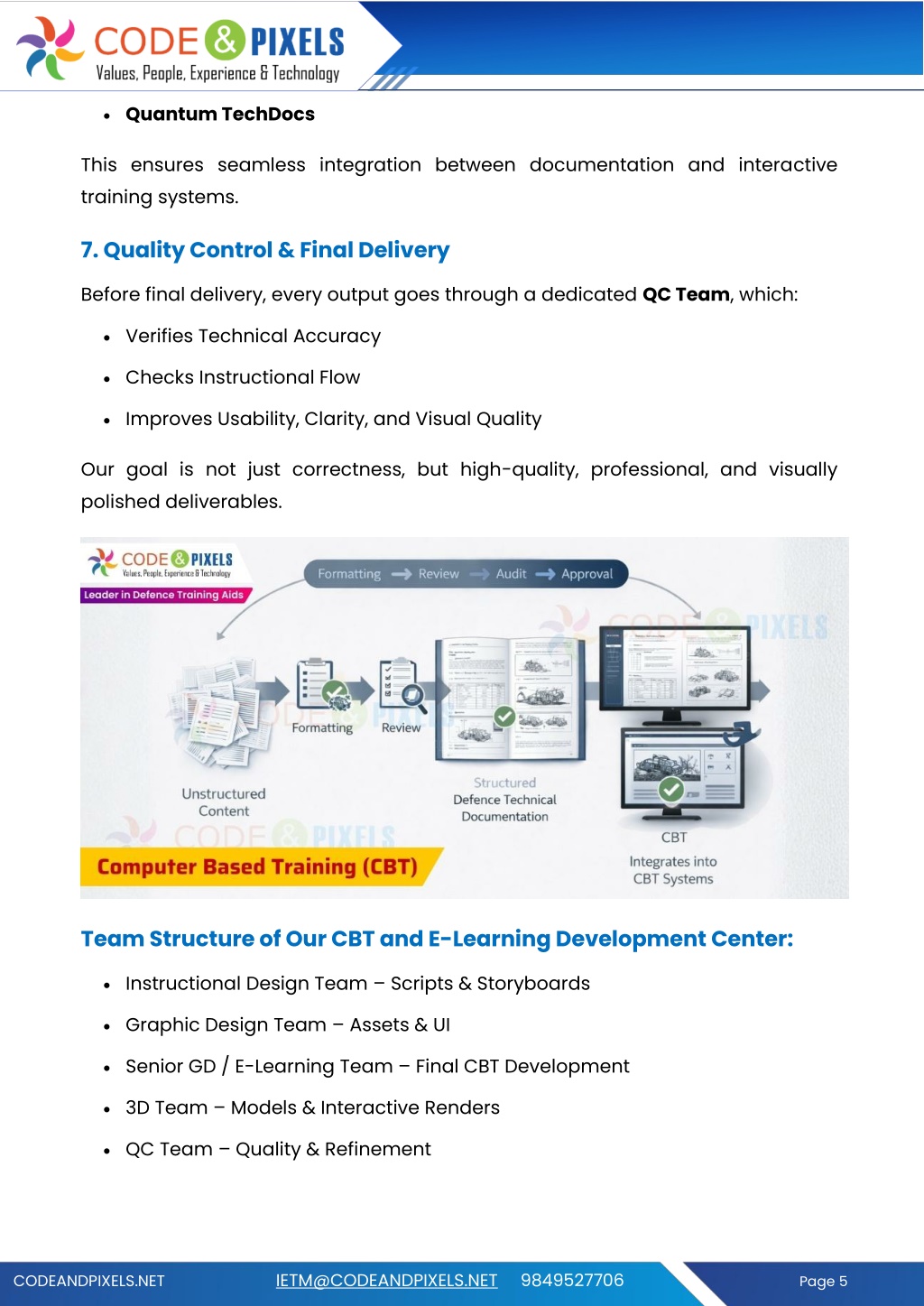 •Quantum TechDocs This ensures seamless integration between documentation and interactive training systems. 7. Quality Control & Final Delivery Before final delivery, every output goes through a dedicated QC Team, which: •Verifies Technical Accuracy •Checks Instructional Flow •Improves Usability, Clarity, and Visual Quality Our goal is not just correctness, but high-quality, professional, and visually polished deliverables. Team Structure of Our CBT and E-Learning Development Center: •Instructional Design Team – Scripts & Storyboards •Graphic Design Team – Assets & UI •Senior GD / E-Learning Team – Final CBT Development •3D Team – Models & Interactive Renders •QC Team – Quality & Refinement CODEANDPIXELS.NET IETM@CODEANDPIXELS.NET 9849527706 Page 5