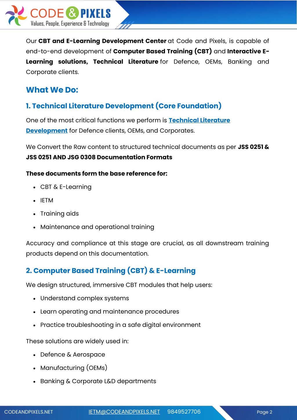 Our CBT and E-Learning Development Center at Code and Pixels, is capable of end-to-end development of Computer Based Training (CBT) and Interactive E- Learning solutions, Technical Literature for Defence, OEMs, Banking and Corporate clients. What We Do: 1. Technical Literature Development (Core Foundation) One of the most critical functions we perform is Technical Literature Development for Defence clients, OEMs, and Corporates. We Convert the Raw content to structured technical documents as per JSS 0251 & JSS 0251 AND JSG 0308 Documentation Formats These documents form the base reference for: •CBT & E-Learning •IETM •Training aids •Maintenance and operational training Accuracy and compliance at this stage are crucial, as all downstream training products depend on this documentation. 2. Computer Based Training (CBT) & E-Learning We design structured, immersive CBT modules that help users: •Understand complex systems •Learn operating and maintenance procedures •Practice troubleshooting in a safe digital environment These solutions are widely used in: •Defence & Aerospace •Manufacturing (OEMs) •Banking & Corporate L&D departments CODEANDPIXELS.NET IETM@CODEANDPIXELS.NET 9849527706 Page 2