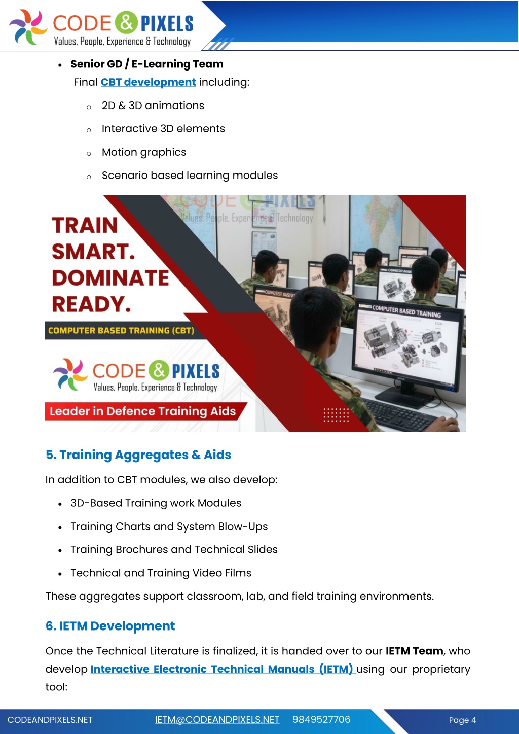 •Senior GD / E-Learning Team Final CBT development including: o2D & 3D animations oInteractive 3D elements oMotion graphics oScenario based learning modules 5. Training Aggregates & Aids In addition to CBT modules, we also develop: •3D-Based Training work Modules •Training Charts and System Blow-Ups •Training Brochures and Technical Slides •Technical and Training Video Films These aggregates support classroom, lab, and field training environments. 6. IETM Development Once the Technical Literature is finalized, it is handed over to our IETM Team, who develop Interactive Electronic Technical Manuals (IETM) using our proprietary tool: CODEANDPIXELS.NET IETM@CODEANDPIXELS.NET 9849527706 Page 4