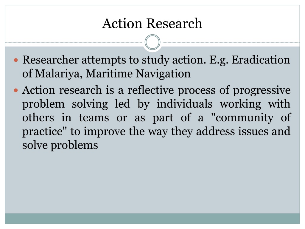 Action Research Researcher attempts to study action. E.g. Eradication of Malariya, Maritime Navigation Action research is a reflective process of progressive problem solving led by individuals working with others in teams or as part of a "community of practice" to improve the way they address issues and solve problems