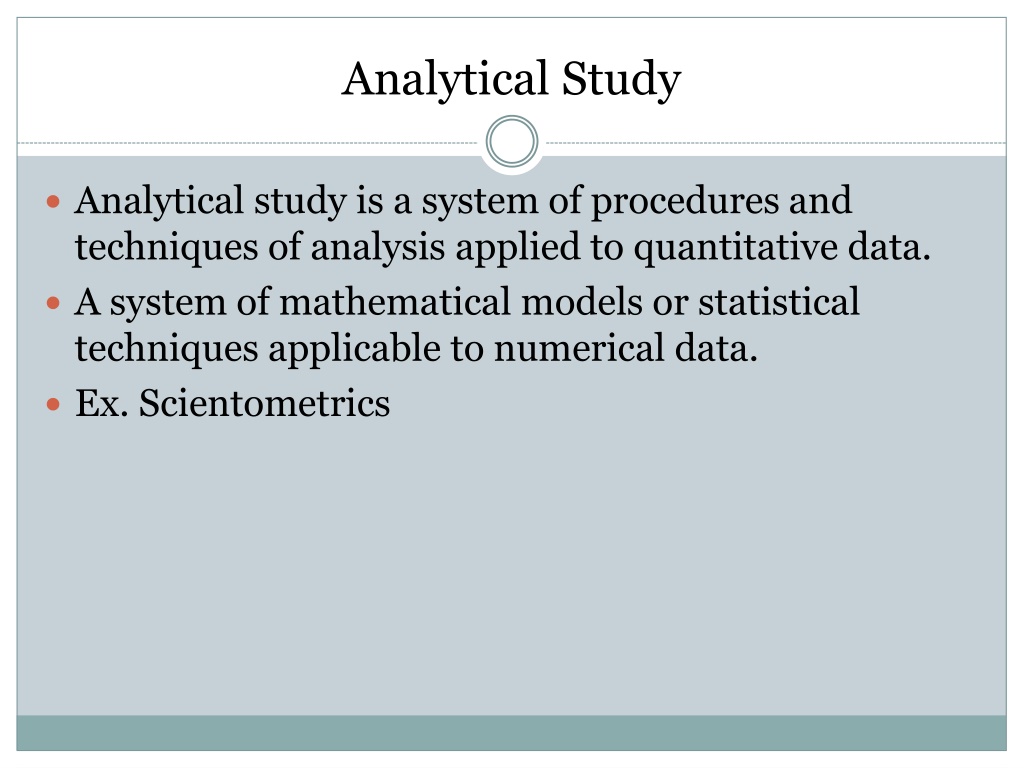 Analytical Study Analytical study is a system of procedures and techniques of analysis applied to quantitative data. A system of mathematical models or statistical techniques applicable to numerical data. Ex. Scientometrics