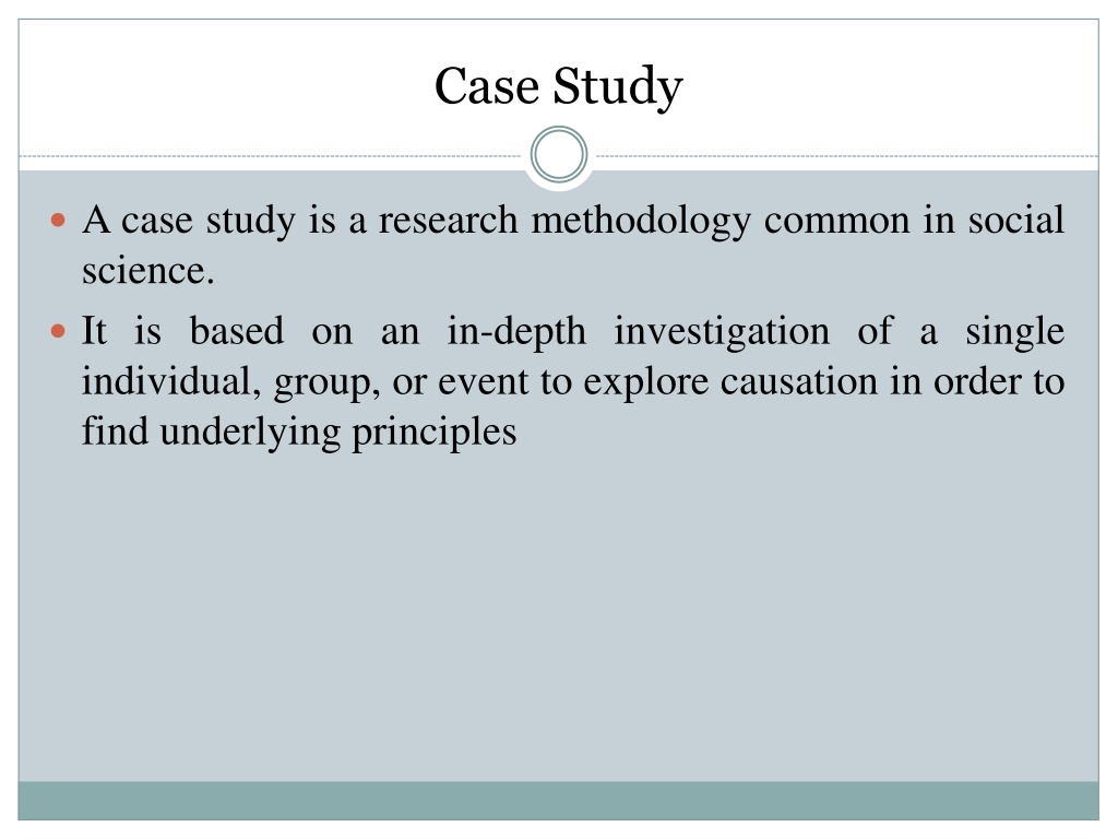 Case Study A case study is a research methodology common in social science. It is based on an in-depth investigation of a single individual, group, or event to explore causation in order to find underlying principles