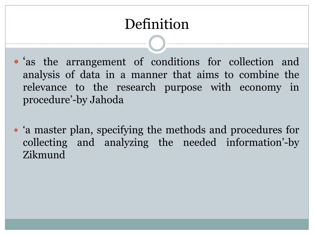 Definition • ‘as the arrangement of conditions for collection and analysis of data in a manner that aims to combine the relevance to the research purpose with economy in procedure’-by Jahoda • ‘a master plan, specifying the methods and procedures for collecting and analyzing the needed information’-by Zikmund