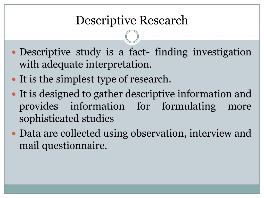 Descriptive Research Descriptive study is a fact- finding investigation with adequate interpretation. It is the simplest type of research. It is designed to gather descriptive information and provides information for formulating more sophisticated studies Data are collected using observation, interview and mail questionnaire.