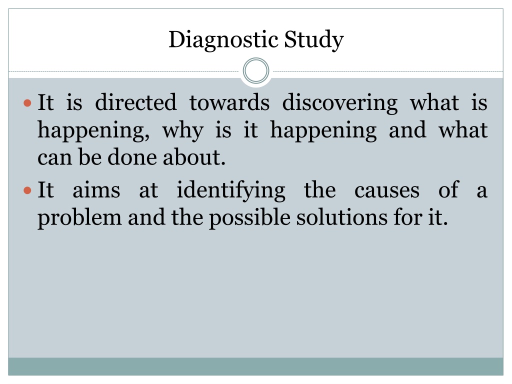 Diagnostic Study It is directed towards discovering what is happening, why is it happening and what can be done about. It aims at identifying the causes of a problem and the possible solutions for it.