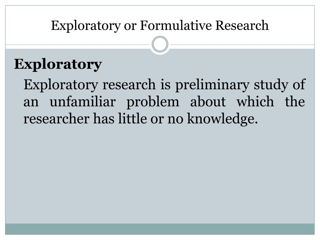 Exploratory or Formulative Research Exploratory Exploratory research is preliminary study of an unfamiliar problem about which the researcher has little or no knowledge.