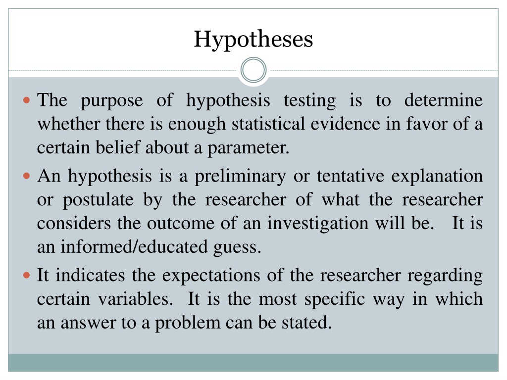 Hypotheses The purpose of hypothesis testing is to determine whether there is enough statistical evidence in favor of a certain belief about a parameter. An hypothesis is a preliminary or tentative explanation or postulate by the researcher of what the researcher considers the outcome of an investigation will be. It is an informed/educated guess. It indicates the expectations of the researcher regarding certain variables. It is the most specific way in which an answer to a problem can be stated.