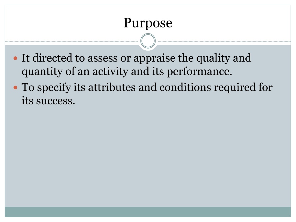 Purpose It directed to assess or appraise the quality and quantity of an activity and its performance. To specify its attributes and conditions required for its success.