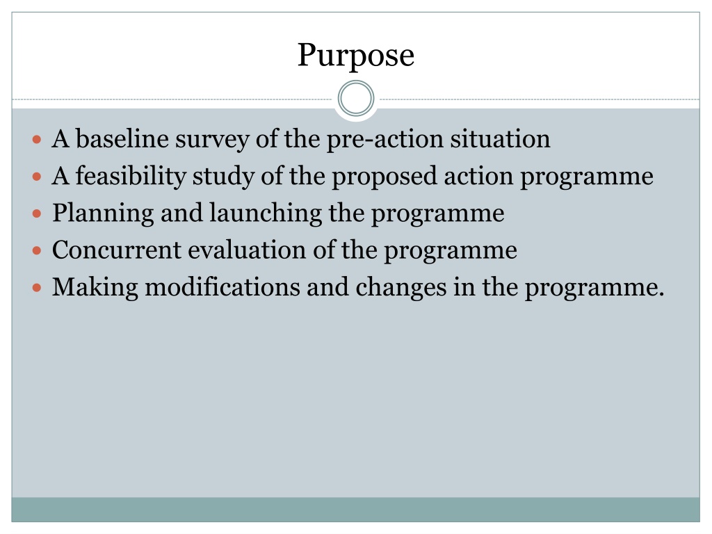 Purpose A baseline survey of the pre-action situation A feasibility study of the proposed action programme Planning and launching the programme Concurrent evaluation of the programme Making modifications and changes in the programme.