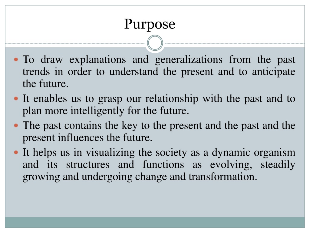 Purpose To draw explanations and generalizations from the past trends in order to understand the present and to anticipate the future. It enables us to grasp our relationship with the past and to plan more intelligently for the future. The past contains the key to the present and the past and the present influences the future. It helps us in visualizing the society as a dynamic organism and its structures and functions as evolving, steadily growing and undergoing change and transformation.