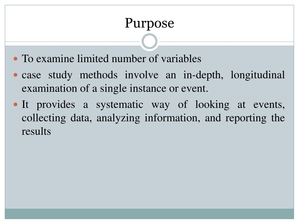 Purpose To examine limited number of variables case study methods involve an in-depth, longitudinal examination of a single instance or event. It provides a systematic way of looking at events, collecting data, analyzing information, and reporting the results