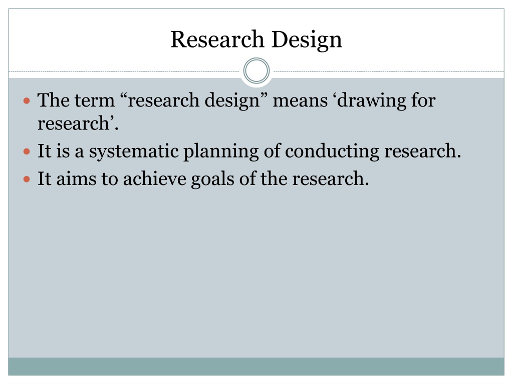 Research Design • The term “research design” means ‘drawing for research’. • It is a systematic planning of conducting research. • It aims to achieve goals of the research.