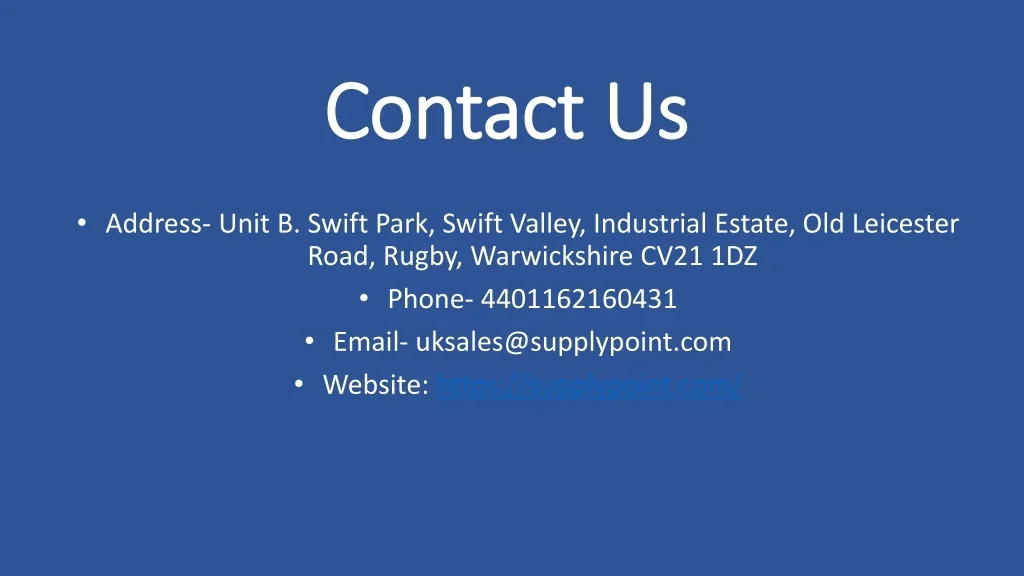 Contact Us Address- Unit B. Swift Park, Swift Valley, Industrial Estate, Old Leicester Road, Rugby, Warwickshire CV21 1DZ Phone- 4401162160431 Email- uksales@supplypoint.com Website: https://supplypoint.com/