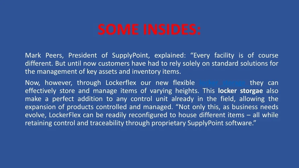 SOME INSIDES: Mark Peers, President of SupplyPoint, explained: “Every facility is of course different. But until now customers have had to rely solely on standard solutions for the management of key assets and inventory items. Now, however, through Lockerflex our new flexible locker storage they can effectively store and manage items of varying heights. This locker storgaealso make a perfect addition to any control unit already in the field, allowing the expansion of products controlled and managed. “Not only this, as business needs evolve, LockerFlex can be readily reconfigured to house different items – all while retaining control and traceability through proprietary SupplyPoint software.”