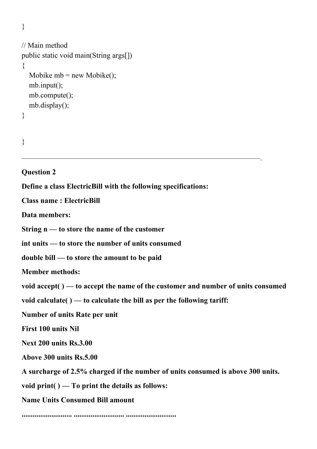 } // Main method public static void main(String args[]) { Mobike mb = new Mobike(); mb.input(); mb.compute(); mb.display(); } } ————————————————————————————————. Question 2 Define a class ElectricBill with the following specifications: Class name : ElectricBill Data members: String n — to store the name of the customer int units — to store the number of units consumed double bill — to store the amount to be paid Member methods: void accept( ) — to accept the name of the customer and number of units consumed void calculate( ) — to calculate the bill as per the following tariff: Number of units Rate per unit First 100 units Nil Next 200 units Rs.3.00 Above 300 units Rs.5.00 A surcharge of 2.5% charged if the number of units consumed is above 300 units. void print( ) — To print the details as follows: Name Units Consumed Bill amount ........................... ........................... ...........................