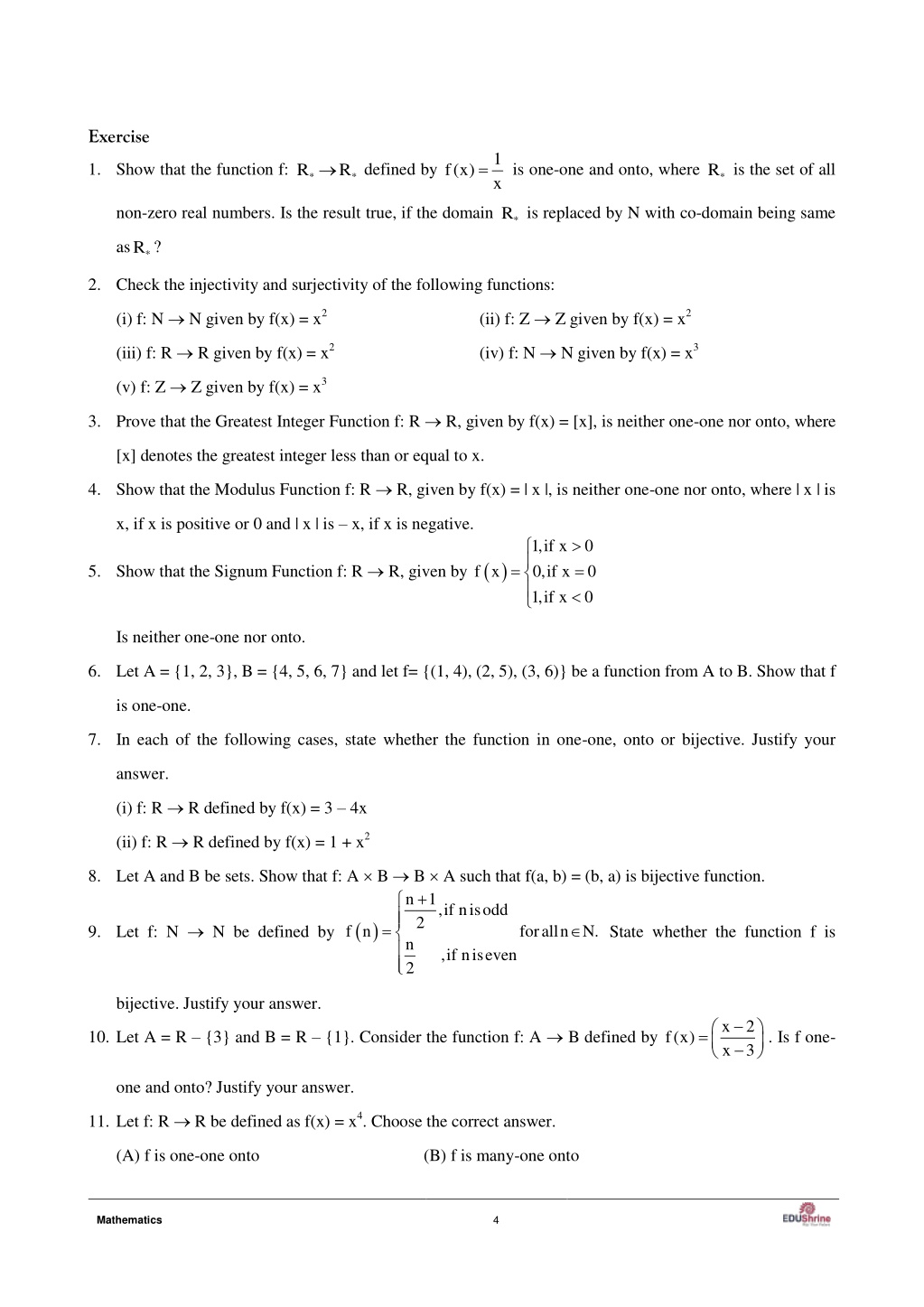 Exercise 1 x 1.Show that the function f: defined by is one-one and onto, where R is the set of all R R f(x) * * * non-zero real numbers. Is the result true, if the domain R is replaced by N with co-domain being same * as R ? * 2.Check the injectivity and surjectivity of the following functions: (i) f: N N given by f(x) = x2 (ii) f: Z Z given by f(x) = x2 (iii) f: R R given by f(x) = x2 (iv) f: N N given by f(x) = x3 (v) f: Z Z given by f(x) = x3 3.Prove that the Greatest Integer Function f: R R, given by f(x) = [x], is neither one-one nor onto, where [x] denotes the greatest integer less than or equal to x. 4.Show that the Modulus Function f: R R, given by f(x) = | x |, is neither one-one nor onto, where | x | is x, if x is positive or 0 and | x | is – x, if x is negative. 1,if x 0,if x 1,if x 0 0 0 5.Show that the Signum Function f: R R, given by f x Is neither one-one nor onto. 6.Let A = {1, 2, 3}, B = {4, 5, 6, 7} and let f= {(1, 4), (2, 5), (3, 6)} be a function from A to B. Show that f is one-one. 7.In each of the following cases, state whether the function in one-one, onto or bijective. Justify your answer. (i) f: R R defined by f(x) = 3 – 4x (ii) f: R R defined by f(x) = 1 + x2 8.Let A and B be sets. Show that f: A B B A such that f(a, b) = (b, a) is bijective function. n 1,if nisodd 2 f n n 2 9.Let f: N N be defined by foralln N. State whether the function f is ,if niseven bijective. Justify your answer. x x 3 2 10.Let A = R – {3} and B = R – {1}. Consider the function f: A B defined by . Is f one- f(x) one and onto? Justify your answer. 11.Let f: R R be defined as f(x) = x4. Choose the correct answer. (A) f is one-one onto (B) f is many-one onto 4 Mathematics