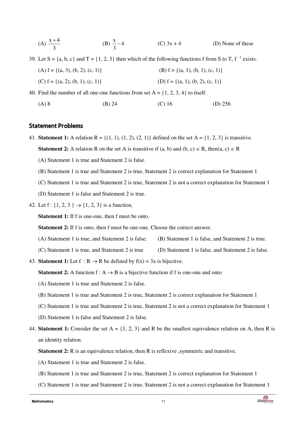 (D) Statement 1 is false and Statement 2 is false. 45.Assertion (A): In set A = {1, 2, 3} a relation R defined as R = {(1, 1), (2, 2)} is reflexive. Reason (R): A relation R is reflexive in set A if (a, a) R for all a A (A) A is false but R is true (B) A is true and R is true (C) A is true but R is false (D) A is false and R is false. 46.Assertion (A): In set A = {1, 2, 3} a relation R in set A , given as R = {(1, 2)} is transitive. Reason (R): A singleton relation is transitive (A) A is false but R is true (B) A is true and R is false (C) A is true but R is false (D) A is true and R is true. 47.Assertion(A): If n(A) = 3, then the number of reflexive relations on A is 3 Reason (R): A relation R on the set A is reflexive if (a, a) R, a A (A) A is false but R is true (B) A is true and R is false (C) A is true but R is true (D) A is false and R is false 48.Assertion(A): A relations R = {(a, a), (b, b), (b, c), (c, c)} defined on the set A = {a, b, c} is symmetric Reason(R): A relation R on the set A is symmetric if (a, b) R (b, a) R (A) A is true but R is true (B) A is false and R is true (C) A is true but R is false (D) A is false and R is false 0, if x is rational 1, if x is irrational 49.Statement I: The function f : R R defined as is bijective f x Statement 2: A function is said to be bijective if it is both one one and onto (A) Statement 1 is true, and Statement 2 is false (B) Statement 1 is false, and Statement 2 is true (C) Statement 1 is true, and Statement 2 is true (D) Statement 1 is false, and Statement 2 is false 50.Statement 1: A function f : A B, can not be an onto function if n(A) < n(B). Statement 2: A function f is onto if every element of co-domain has at least one pre-image in the domain (A) Statement 1 is true and Statement 2 is false. (B) Statement 1 is true and Statement 2 is true, Statement 2 is correct explanation for Statement 1 (C) Statement 1 is true and Statement 2 is true, Statement 2 is not a correct explanation for Statement 1 (D) Statement 1 is false and Statement 2 is false. 51.Consider the set A containing 3 elements. Then, the total number of injective functions from A onto itself is _________ 12 Mathematics