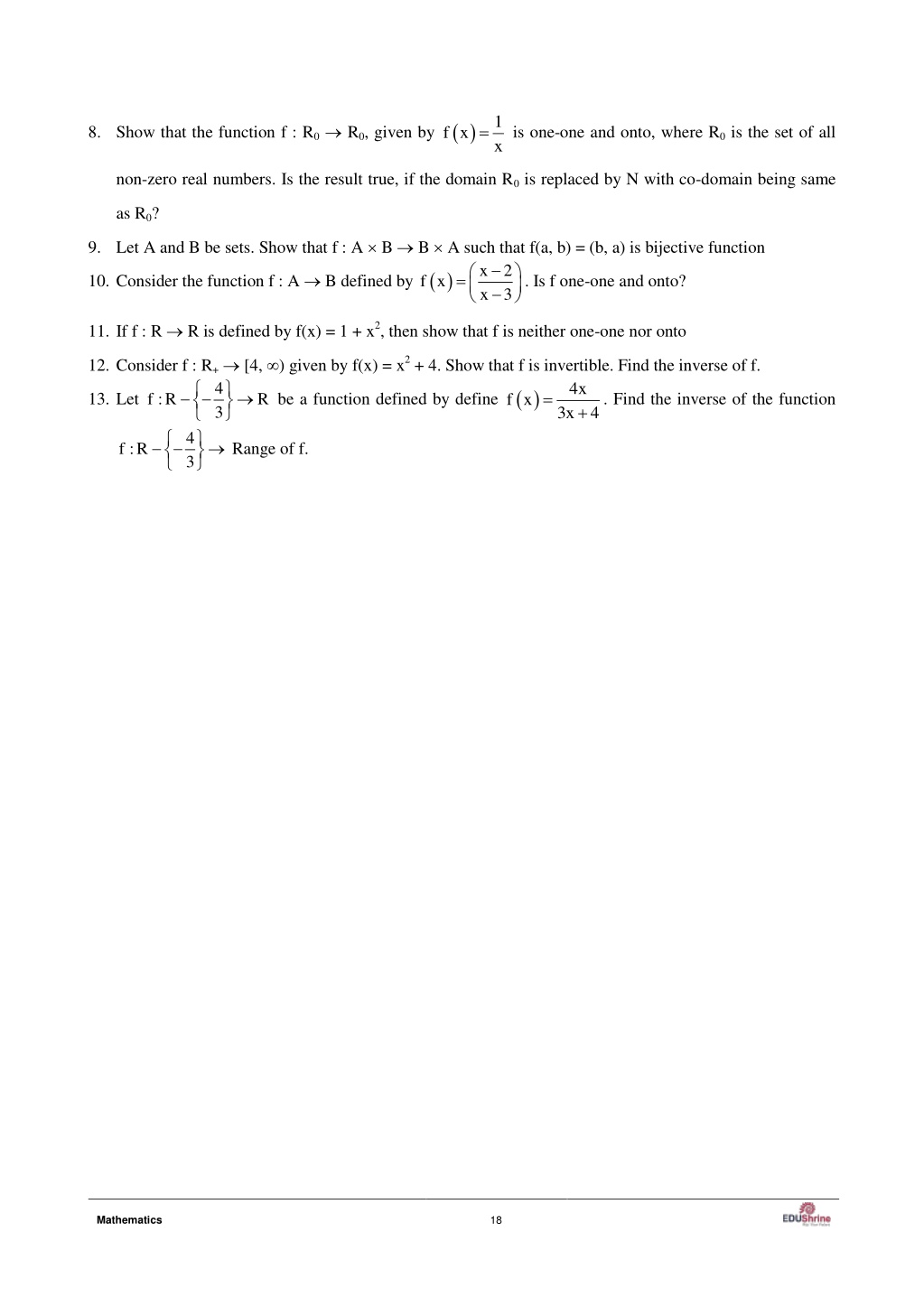 1 x 8.Show that the function f : R0 R0, given by is one-one and onto, where R0 is the set of all f x non-zero real numbers. Is the result true, if the domain R0 is replaced by N with co-domain being same as R0? 9.Let A and B be sets. Show that f : A B B A such that f(a, b) = (b, a) is bijective function x x 3 2 10.Consider the function f : A B defined by . Is f one-one and onto? f x 11.If f : R R is defined by f(x) = 1 + x2, then show that f is neither one-one nor onto 12.Consider f : R+ [4, ) given by f(x) = x2 + 4. Show that f is invertible. Find the inverse of f. 4 f :R R 3 4 f :R 3 4x be a function defined by define 13.Let . Find the inverse of the function f x 3x 4 Range of f. 18 Mathematics
