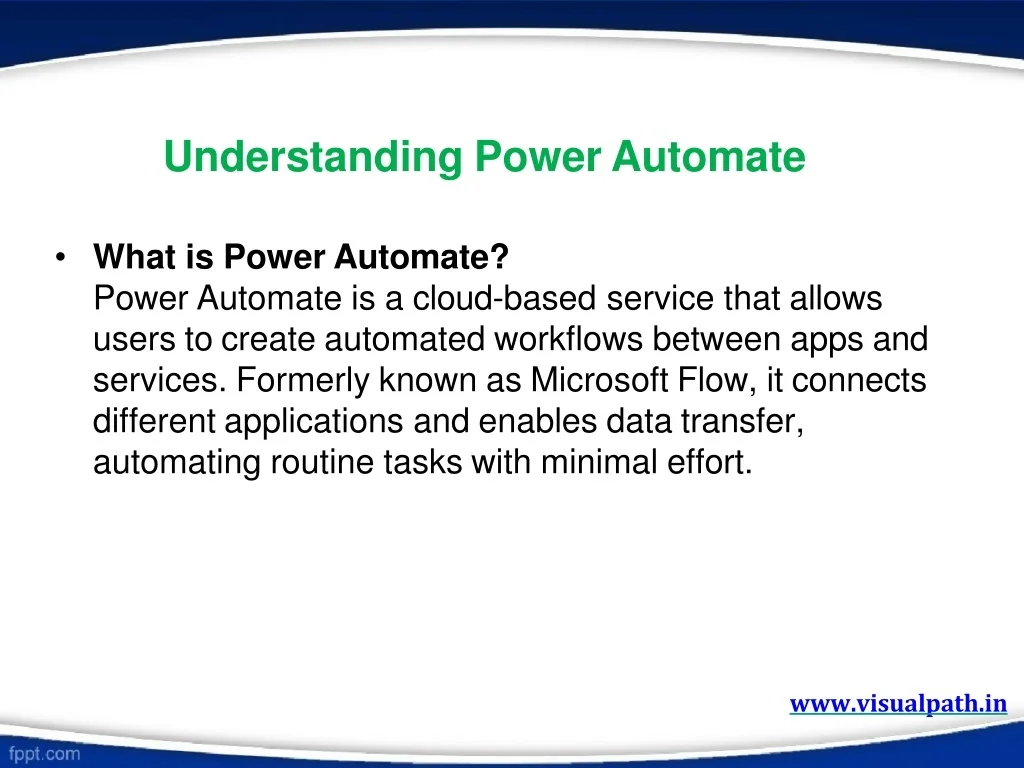 UnderstandingPowerAutomate • WhatisPowerAutomate? • PowerAutomateisacloud-basedservicethatallows userstocreateautomatedworkflowsbetweenappsand services.FormerlyknownasMicrosoftFlow,itconnects differentapplicationsandenablesdatatransfer, automatingroutinetaskswithminimaleffort. www.visualpath.in
