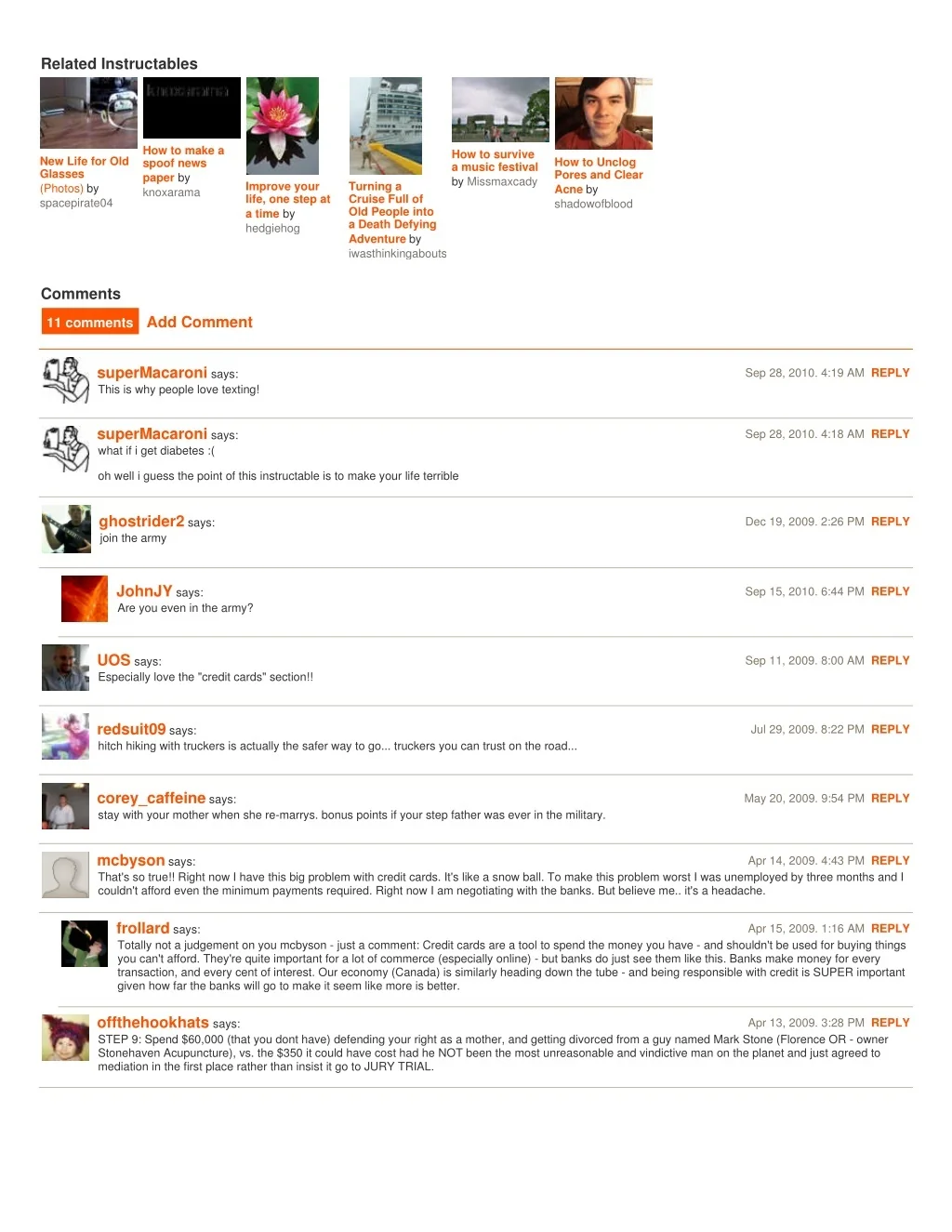 Related Instructables How to make a spoof news paper by knoxarama How to survive a music festival by Missmaxcady New Life for Old Glasses (Photos) by spacepirate04 How to Unclog Pores and Clear Acne by shadowofblood Improve your life, one step at a time by hedgiehog Turning a Cruise Full of Old People into a Death Defying Adventure by iwasthinkingaboutsoup Comments 11 comments Add Comment superMacaroni says: This is why people love texting! Sep 28, 2010. 4:19 AM REPLY superMacaroni says: what if i get diabetes :( Sep 28, 2010. 4:18 AM REPLY oh well i guess the point of this instructable is to make your life terrible ghostrider2 says: join the army Dec 19, 2009. 2:26 PM REPLY JohnJY says: Are you even in the army? Sep 15, 2010. 6:44 PM REPLY UOS says: Especially love the "credit cards" section!! Sep 11, 2009. 8:00 AM REPLY redsuit09 says: hitch hiking with truckers is actually the safer way to go... truckers you can trust on the road... Jul 29, 2009. 8:22 PM REPLY corey_caffeine says: stay with your mother when she re-marrys. bonus points if your step father was ever in the military. May 20, 2009. 9:54 PM REPLY mcbyson says: That's so true!! Right now I have this big problem with credit cards. It's like a snow ball. To make this problem worst I was unemployed by three months and I couldn't afford even the minimum payments required. Right now I am negotiating with the banks. But believe me.. it's a headache. Apr 14, 2009. 4:43 PM REPLY frollard says: Totally not a judgement on you mcbyson - just a comment: Credit cards are a tool to spend the money you have - and shouldn't be used for buying things you can't afford. They're quite important for a lot of commerce (especially online) - but banks do just see them like this. Banks make money for every transaction, and every cent of interest. Our economy (Canada) is similarly heading down the tube - and being responsible with credit is SUPER important given how far the banks will go to make it seem like more is better. Apr 15, 2009. 1:16 AM REPLY offthehookhats says: STEP 9: Spend $60,000 (that you dont have) defending your right as a mother, and getting divorced from a guy named Mark Stone (Florence OR - owner Stonehaven Acupuncture), vs. the $350 it could have cost had he NOT been the most unreasonable and vindictive man on the planet and just agreed to mediation in the first place rather than insist it go to JURY TRIAL. Apr 13, 2009. 3:28 PM REPLY http://www.instructables.com/id/Ways-to-Ruin-Your-Life-or-make-it-suck-really-bad/
