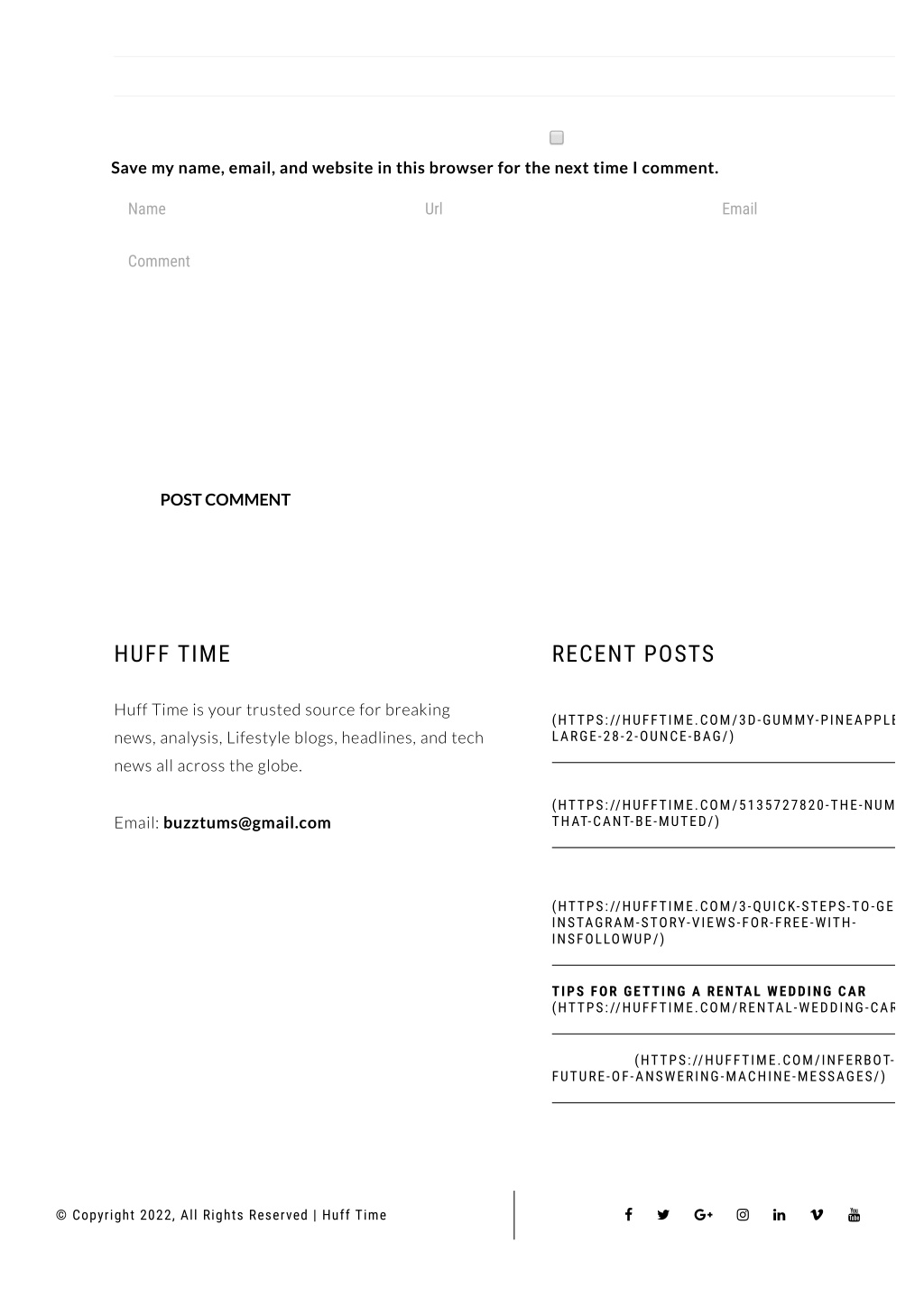 LEAVE A COMMENT Save my name, email, and website in this browser for the next time I comment. Name Url Email Comment POST COMMENT HUFF TIME RECENT POSTS 3D GUMMY PINEAPPLE LARGE 28.2 OUNCE BAG (HTTPS://HUFFTIME.COM/3D-GUMMY-PINEAPPLE- LARGE-28-2-OUNCE-BAG/) Huff Time is your trusted source for breaking news, analysis, Lifestyle blogs, headlines, and tech news all across the globe. 5135727820: THE NUMBER THAT CAN’T BE MUTED (HTTPS://HUFFTIME.COM/5135727820-THE-NUMBER- THAT-CANT-BE-MUTED/) Email: buzztums@gmail.com 3 QUICK STEPS TO GET INSTAGRAM STORY VIEWS FOR FREE WITH INSFOLLOWUP (HTTPS://HUFFTIME.COM/3-QUICK-STEPS-TO-GET- INSTAGRAM-STORY-VIEWS-FOR-FREE-WITH- INSFOLLOWUP/) TIPS FOR GETTING A RENTAL WEDDING CAR (HTTPS://HUFFTIME.COM/RENTAL-WEDDING-CAR/) (NO TITLE) (HTTPS://HUFFTIME.COM/INFERBOT-THE- FUTURE-OF-ANSWERING-MACHINE-MESSAGES/) © Copyright 2022, All Rights Reserved | Huff Time