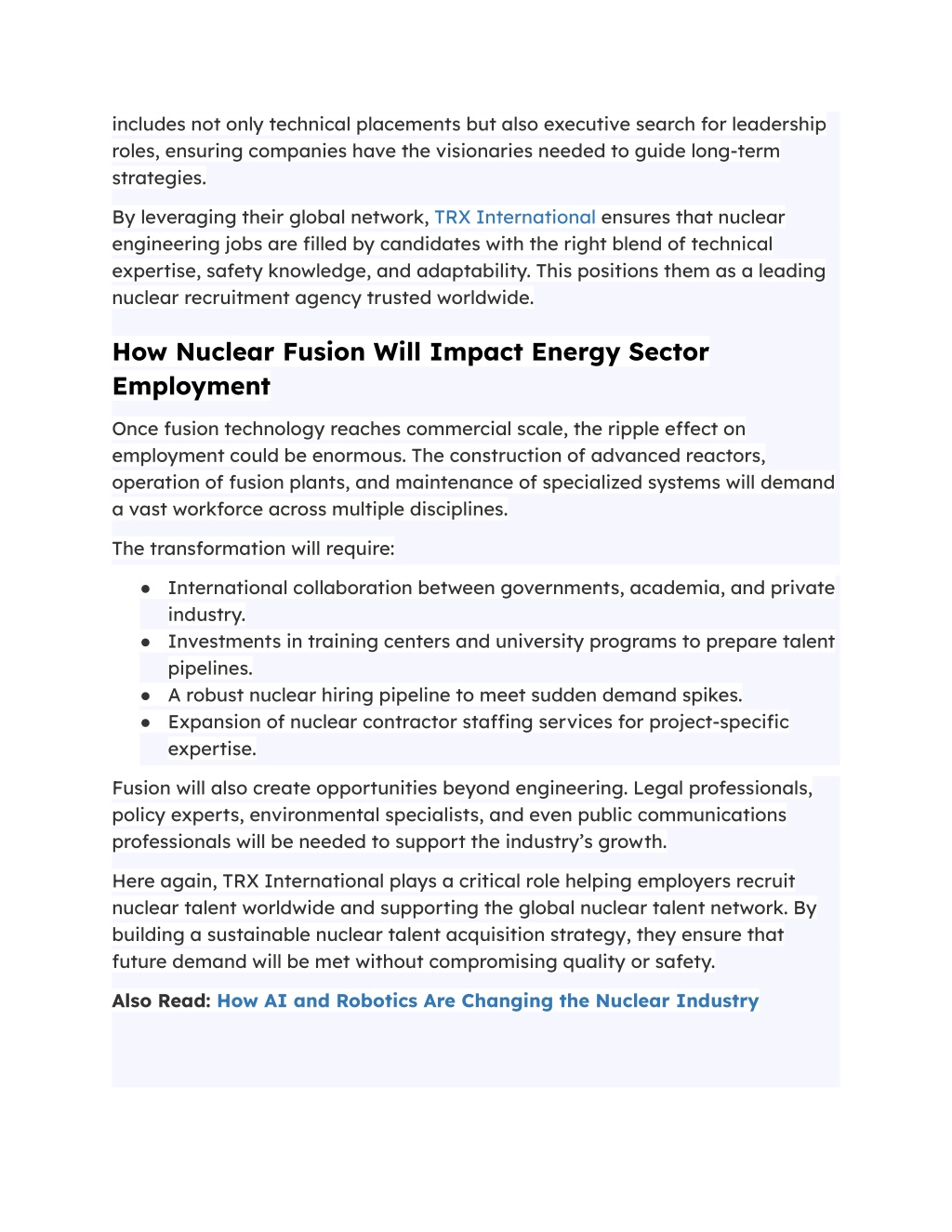 includes not only technical placements but also executive search for leadership roles, ensuring companies have the visionaries needed to guide long-term strategies. By leveraging their global network, TRX International ensures that nuclear engineering jobs are filled by candidates with the right blend of technical expertise, safety knowledge, and adaptability. This positions them as a leading nuclear recruitment agency trusted worldwide. How Nuclear Fusion Will Impact Energy Sector Employment Once fusion technology reaches commercial scale, the ripple effect on employment could be enormous. The construction of advanced reactors, operation of fusion plants, and maintenance of specialized systems will demand a vast workforce across multiple disciplines. The transformation will require: ● International collaboration between governments, academia, and private industry. ● Investments in training centers and university programs to prepare talent pipelines. ● A robust nuclear hiring pipeline to meet sudden demand spikes. ● Expansion of nuclear contractor staffing services for project-specific expertise. Fusion will also create opportunities beyond engineering. Legal professionals, policy experts, environmental specialists, and even public communications professionals will be needed to support the industry’s growth. Here again, TRX International plays a critical role helping employers recruit nuclear talent worldwide and supporting the global nuclear talent network. By building a sustainable nuclear talent acquisition strategy, they ensure that future demand will be met without compromising quality or safety. Also Read: How AI and Robotics Are Changing the Nuclear Industry