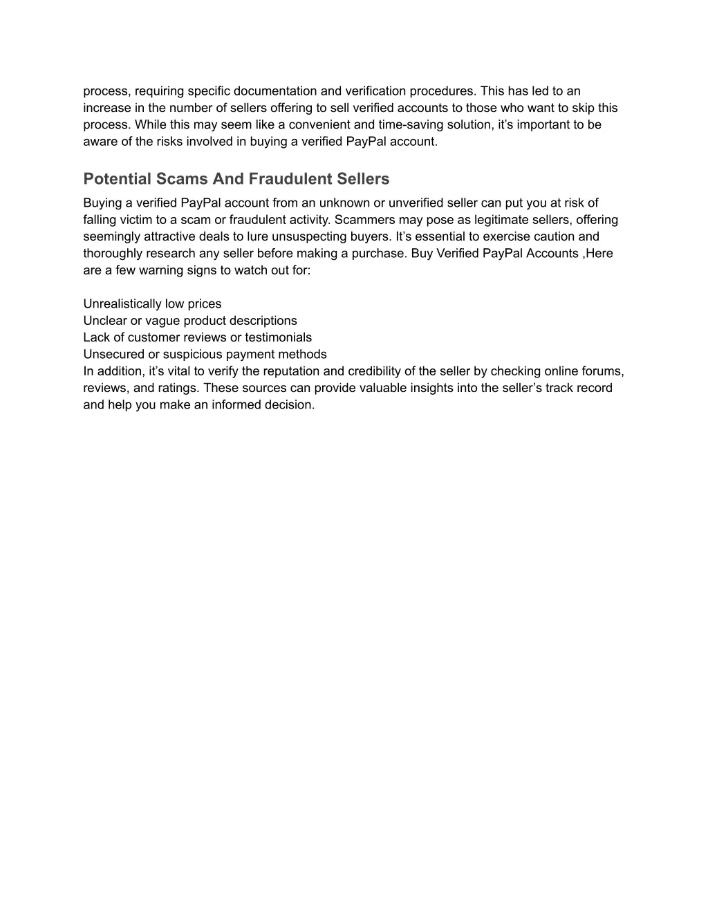process, requiring specific documentation and verification procedures. This has led to an increase in the number of sellers offering to sell verified accounts to those who want to skip this process. While this may seem like a convenient and time-saving solution, it’s important to be aware of the risks involved in buying a verified PayPal account. Potential Scams And Fraudulent Sellers Buying a verified PayPal account from an unknown or unverified seller can put you at risk of falling victim to a scam or fraudulent activity. Scammers may pose as legitimate sellers, offering seemingly attractive deals to lure unsuspecting buyers. It’s essential to exercise caution and thoroughly research any seller before making a purchase. Buy Verified PayPal Accounts ,Here are a few warning signs to watch out for: Unrealistically low prices Unclear or vague product descriptions Lack of customer reviews or testimonials Unsecured or suspicious payment methods In addition, it’s vital to verify the reputation and credibility of the seller by checking online forums, reviews, and ratings. These sources can provide valuable insights into the seller’s track record and help you make an informed decision.