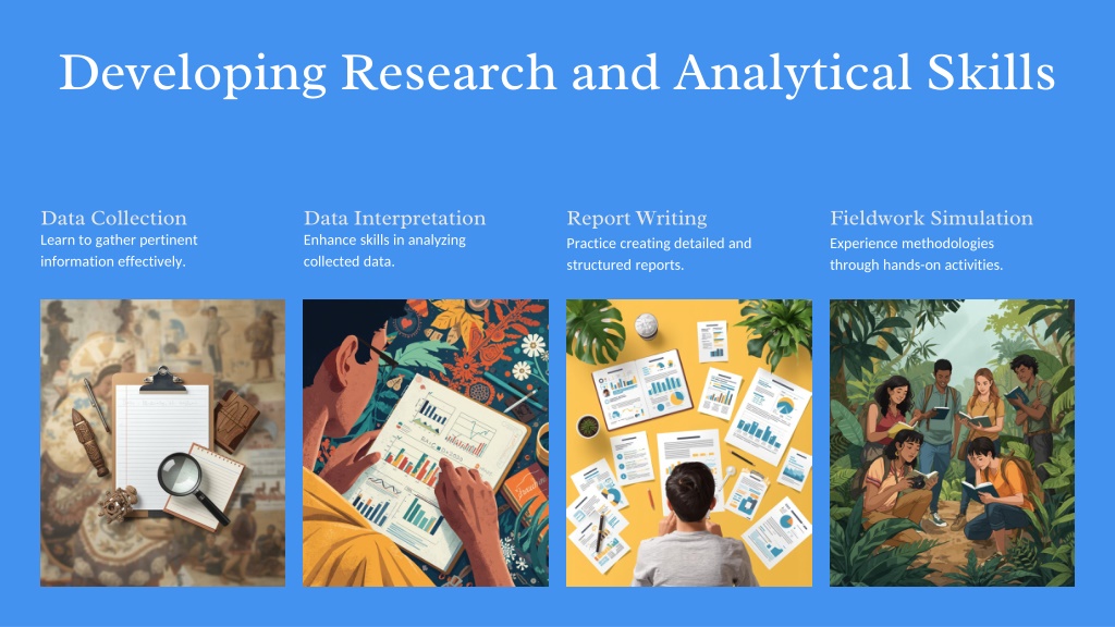 6. Data Collection • Report Writing • Data Interpretation • Fieldwork Simulation • Learn to gather pertinent information effectively. • Enhance skills in analyzing collected data. • Practice creating detailed and structured reports. • Experience methodologies through hands-on activities. • Developing Research and Analytical Skills
