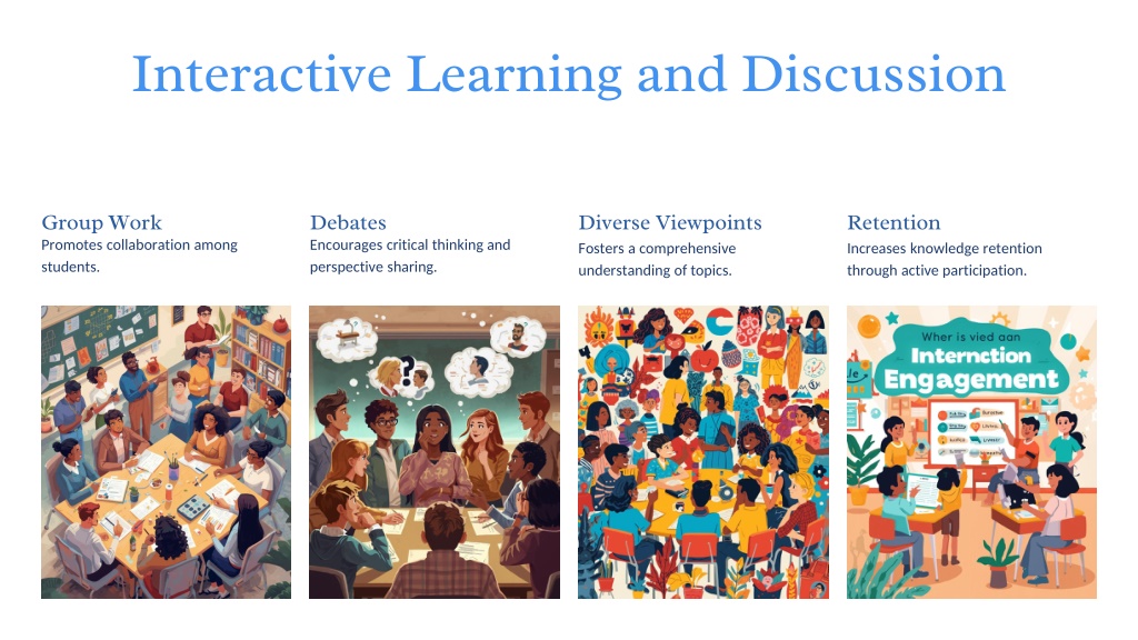 7. Group Work • Diverse Viewpoints • Debates • Retention • Promotes collaboration among students. • Encourages critical thinking and perspective sharing. • Fosters a comprehensive understanding of topics. • Increases knowledge retention through active participation. • Interactive Learning and Discussion