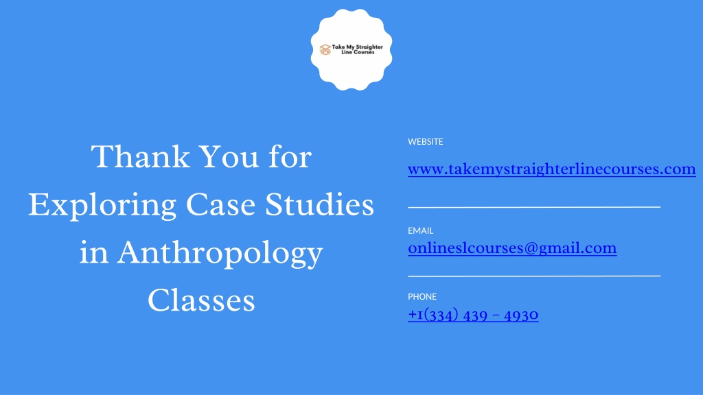 8. WEBSITE • www.takemystraighterlinecourses.com • EMAIL • Thank You for Exploring Case Studies in Anthropology Classes • onlineslcourses@gmail.com • PHONE • +1(334) 439 – 4930