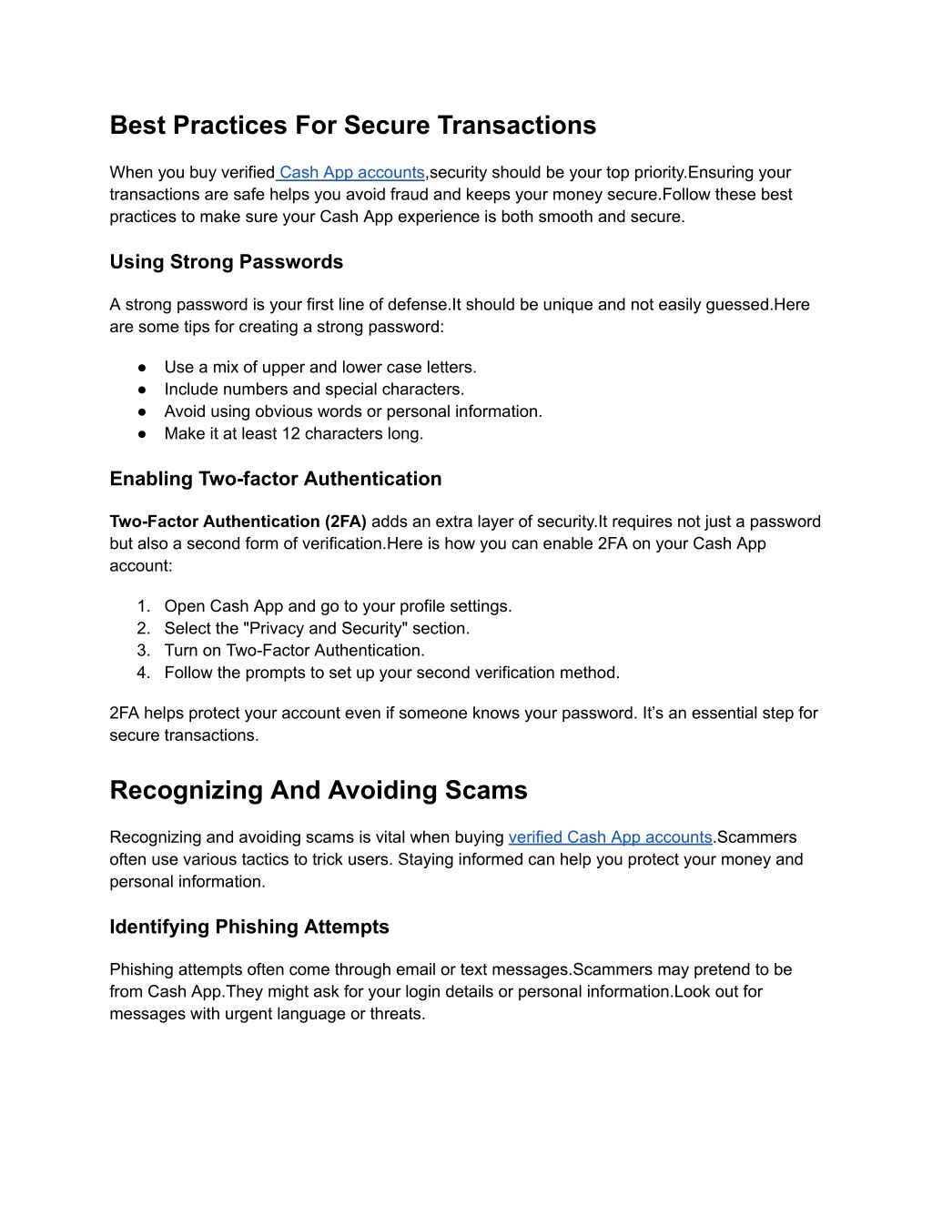 Best Practices For Secure Transactions When you buy verified Cash App accounts,security should be your top priority.Ensuring your transactions are safe helps you avoid fraud and keeps your money secure.Follow these best practices to make sure your Cash App experience is both smooth and secure. Using Strong Passwords A strong password is your first line of defense.It should be unique and not easily guessed.Here are some tips for creating a strong password: ● Use a mix of upper and lower case letters. ● Include numbers and special characters. ● Avoid using obvious words or personal information. ● Make it at least 12 characters long. Enabling Two-factor Authentication Two-Factor Authentication (2FA) adds an extra layer of security.It requires not just a password but also a second form of verification.Here is how you can enable 2FA on your Cash App account: 1. Open Cash App and go to your profile settings. 2. Select the "Privacy and Security" section. 3. Turn on Two-Factor Authentication. 4. Follow the prompts to set up your second verification method. 2FA helps protect your account even if someone knows your password. It’s an essential step for secure transactions. Recognizing And Avoiding Scams Recognizing and avoiding scams is vital when buying verified Cash App accounts.Scammers often use various tactics to trick users. Staying informed can help you protect your money and personal information. Identifying Phishing Attempts Phishing attempts often come through email or text messages.Scammers may pretend to be from Cash App.They might ask for your login details or personal information.Look out for messages with urgent language or threats.