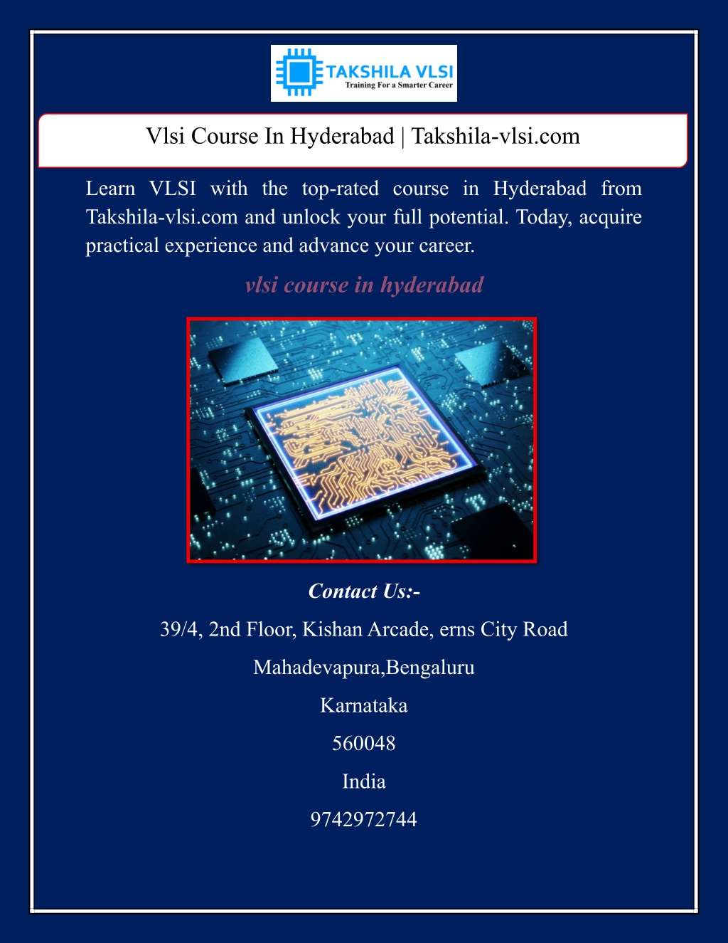 1. Vlsi Course In Hyderabad | Takshila-vlsi.com Learn VLSI with the top-rated course in Hyderabad from Takshila-vlsi.com and unlock your full potential. Today, acquire practical experience and advance your career. vlsi course in hyderabad Contact Us:- 39/4, 2nd Floor, Kishan Arcade, erns City Road Mahadevapura,Bengaluru Karnataka 560048 India 9742972744