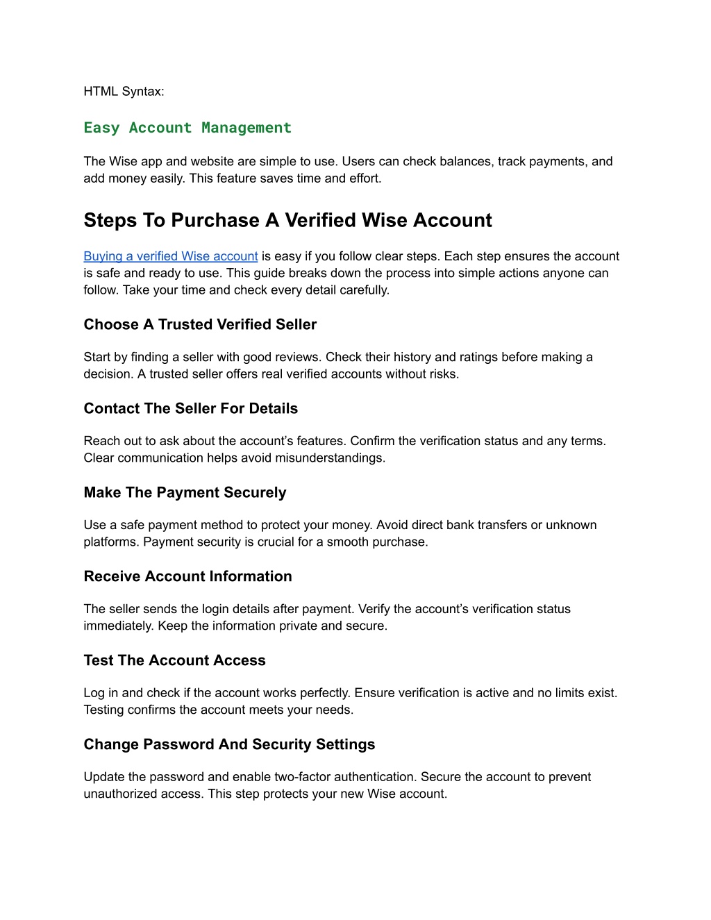 HTML Syntax: Easy Account Management The Wise app and website are simple to use. Users can check balances, track payments, and add money easily. This feature saves time and effort. Steps To Purchase A Verified Wise Account Buying a verified Wise account is easy if you follow clear steps. Each step ensures the account is safe and ready to use. This guide breaks down the process into simple actions anyone can follow. Take your time and check every detail carefully. Choose A Trusted Verified Seller Start by finding a seller with good reviews. Check their history and ratings before making a decision. A trusted seller offers real verified accounts without risks. Contact The Seller For Details Reach out to ask about the account’s features. Confirm the verification status and any terms. Clear communication helps avoid misunderstandings. Make The Payment Securely Use a safe payment method to protect your money. Avoid direct bank transfers or unknown platforms. Payment security is crucial for a smooth purchase. Receive Account Information The seller sends the login details after payment. Verify the account’s verification status immediately. Keep the information private and secure. Test The Account Access Log in and check if the account works perfectly. Ensure verification is active and no limits exist. Testing confirms the account meets your needs. Change Password And Security Settings Update the password and enable two-factor authentication. Secure the account to prevent unauthorized access. This step protects your new Wise account.